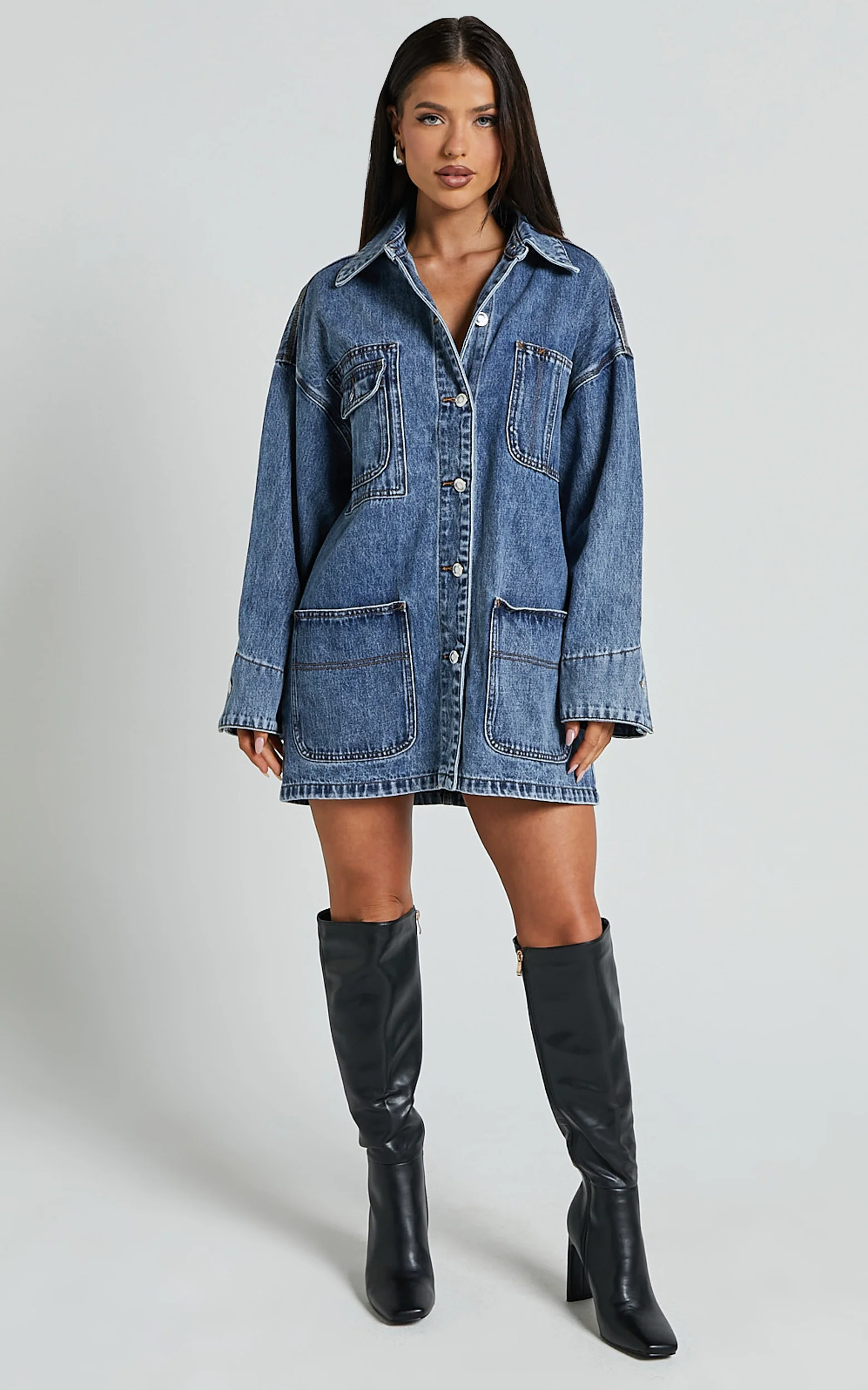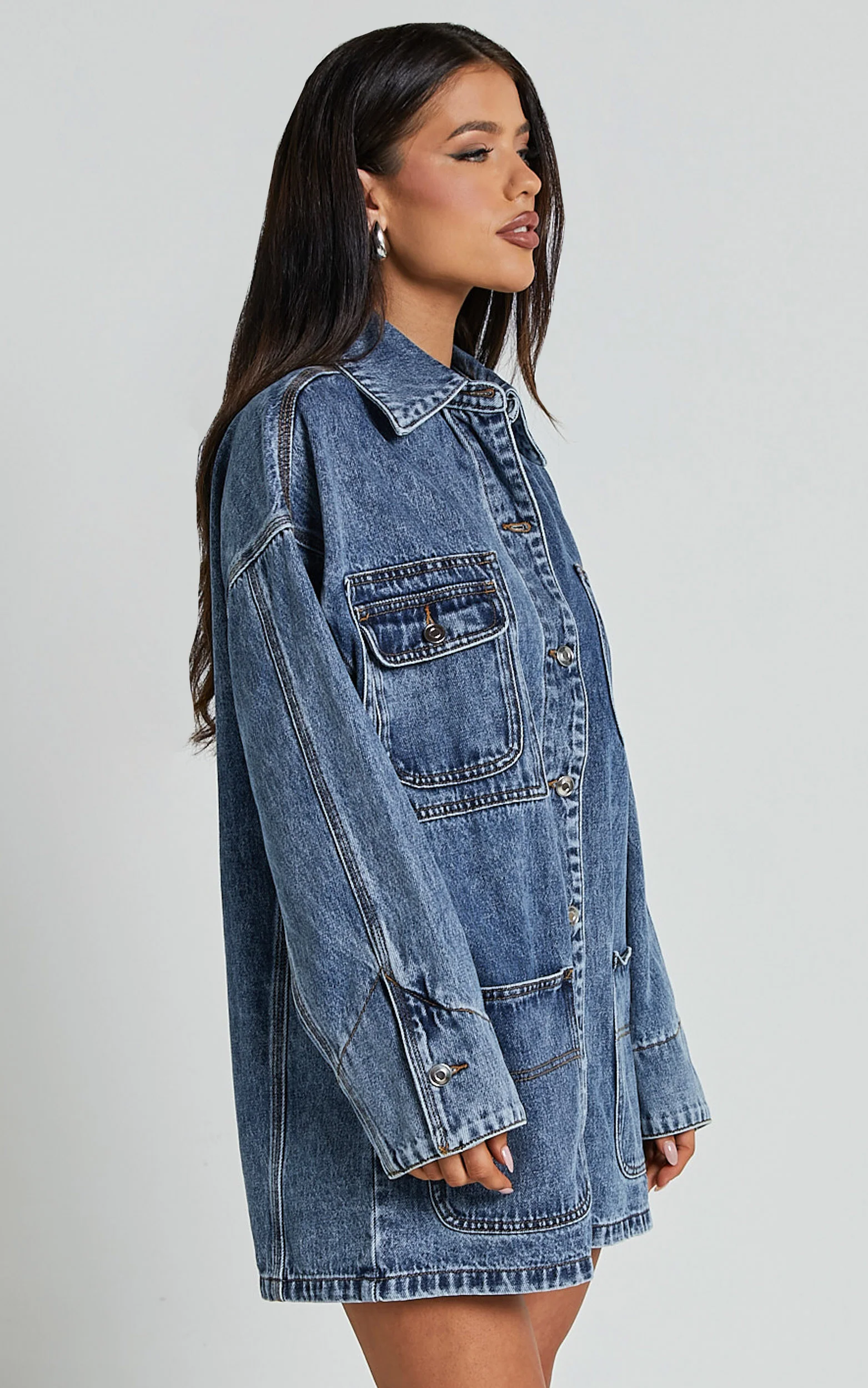 Harlow Jacket - Oversized Long Sleeve Denim Jacket in Mid Blue Wash