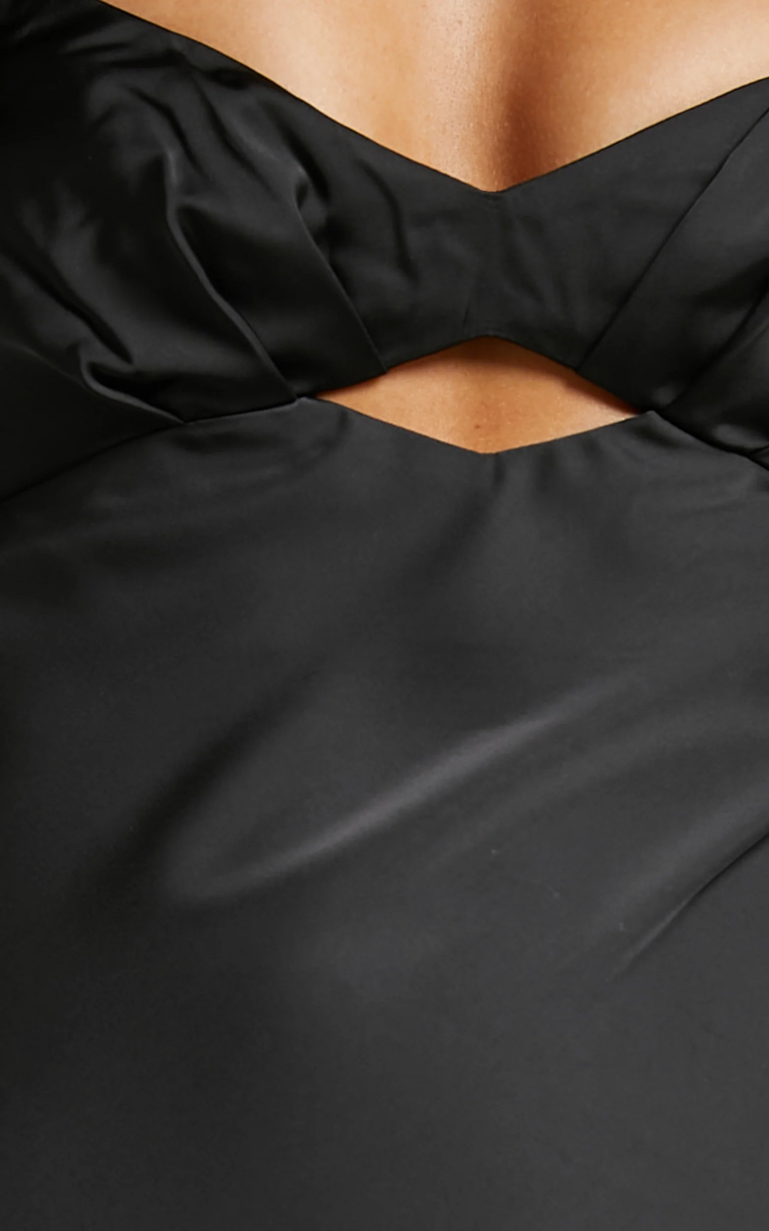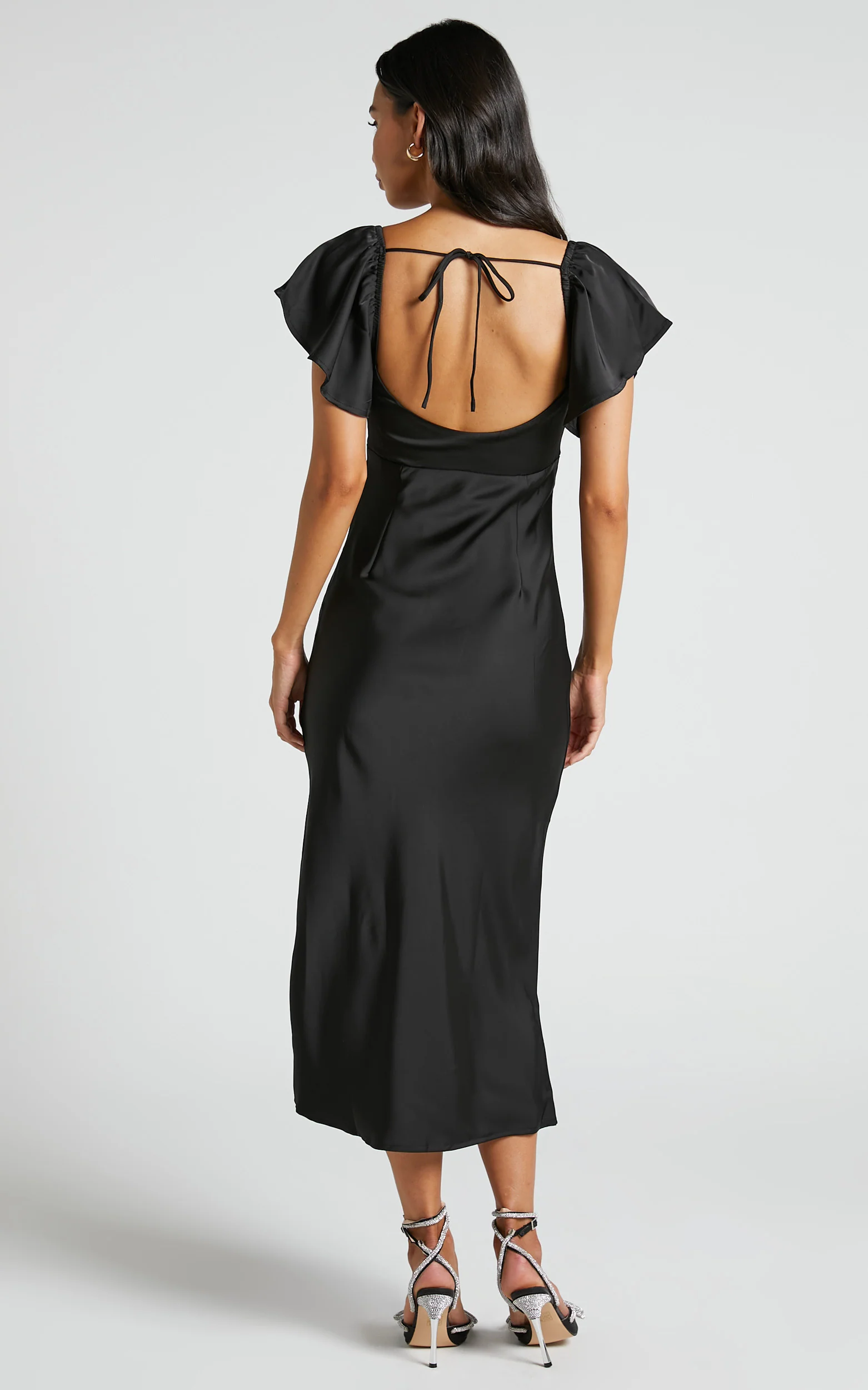 Emberlynn Midi Dress - Flutter Sleeve Cut Out Satin Dress in Black