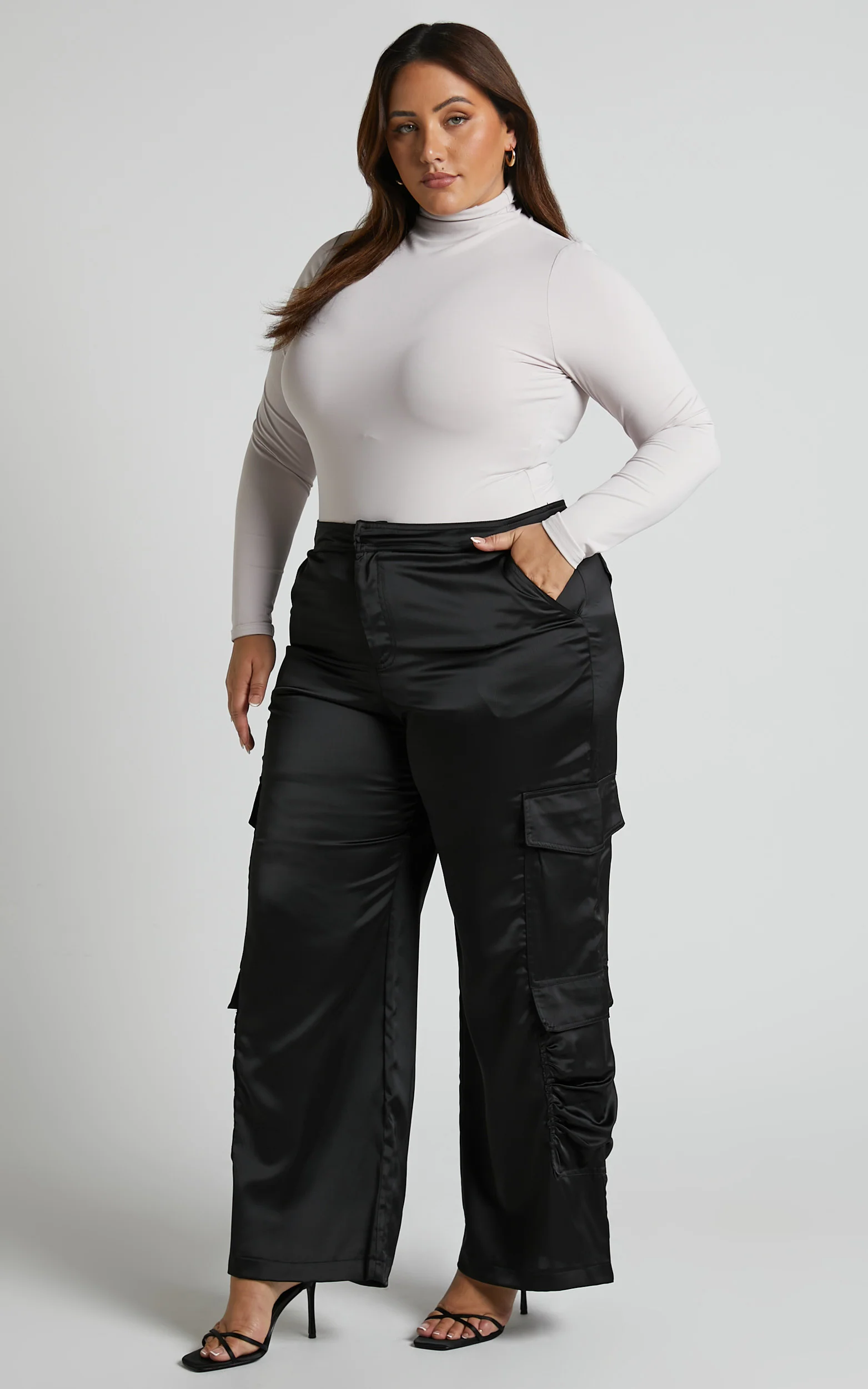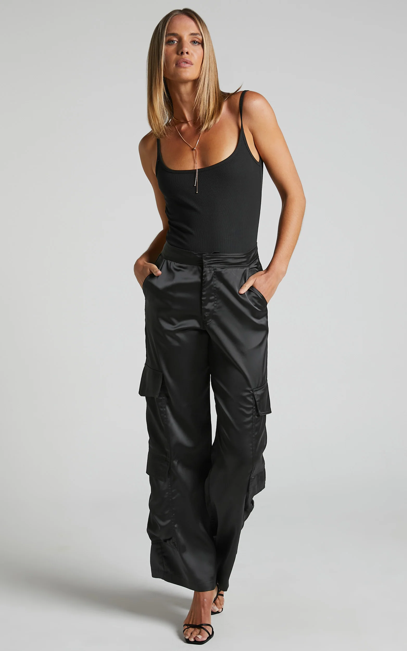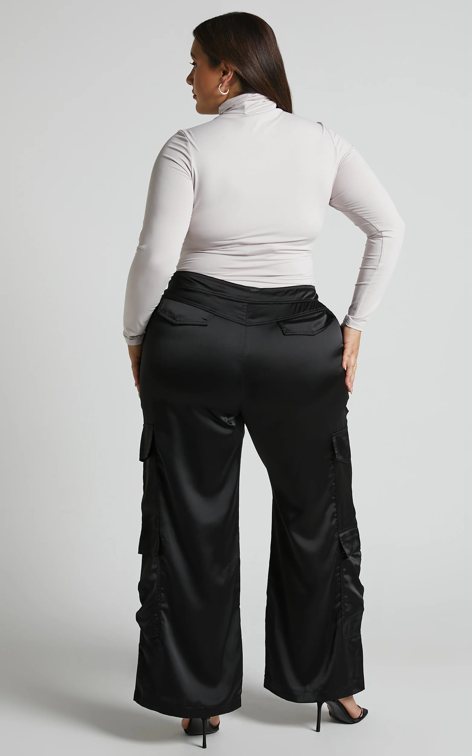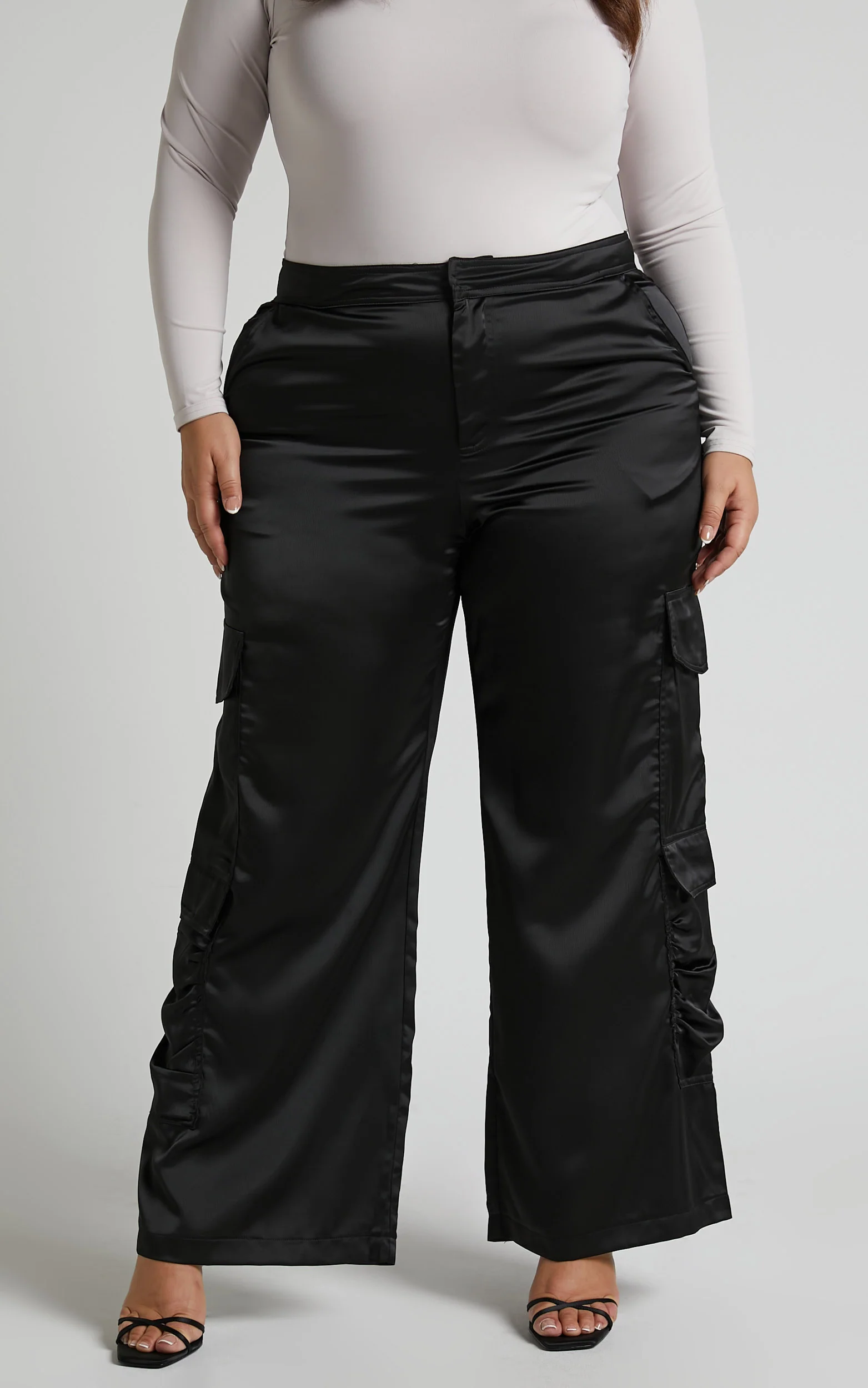 Saori Pants - Mid Rise Satin Cargo Pants in Black