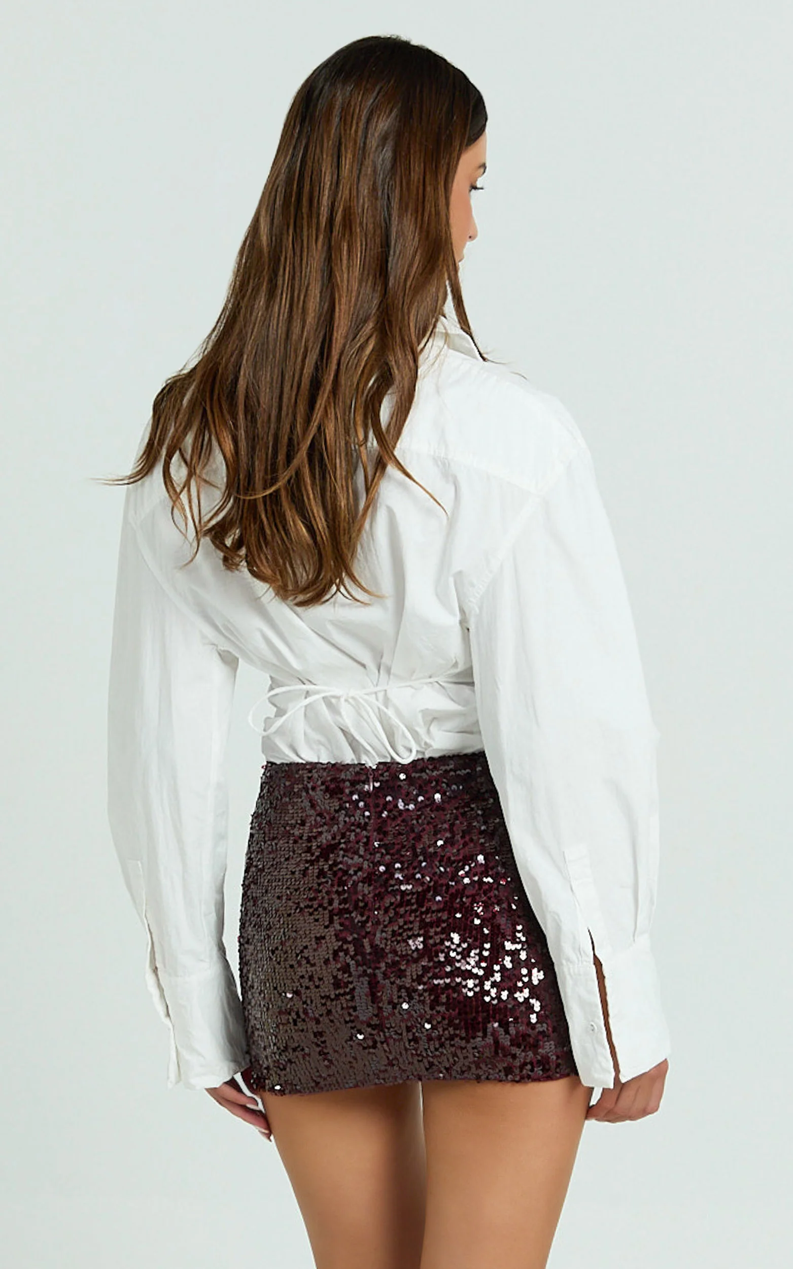Lindy Mini Skirt - Low Rise Sequin Skirt in Wine