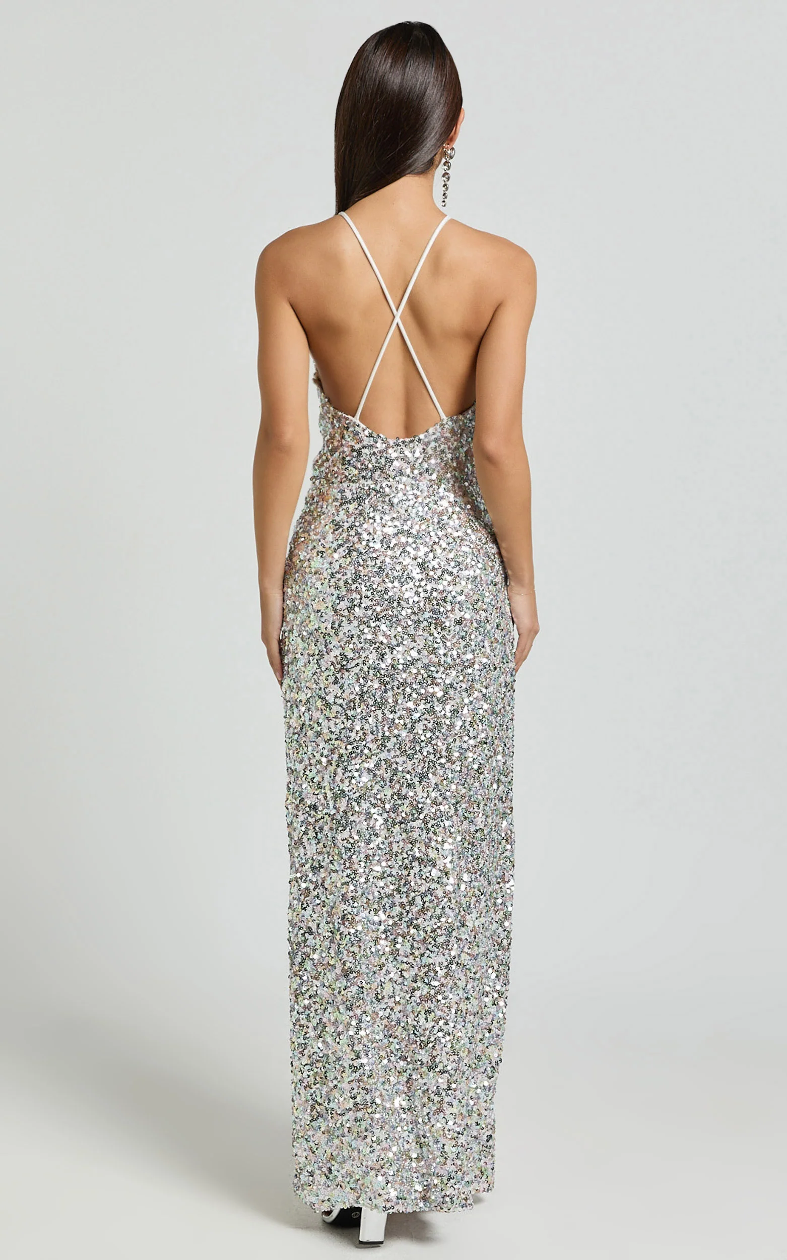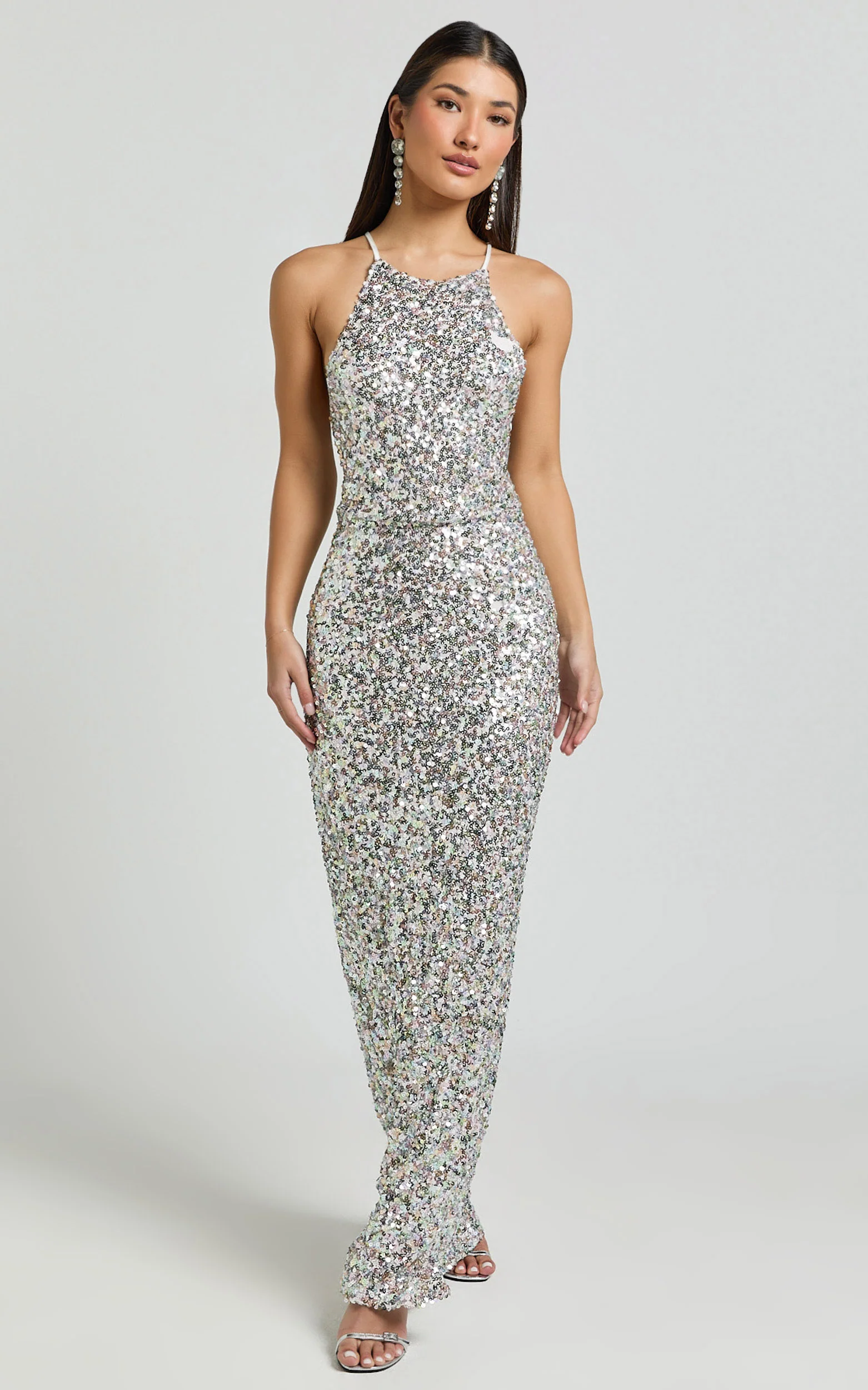 Frieda Maxi Dress - Halter Neck Cross Back Sequin Dress in Rainbow Silver