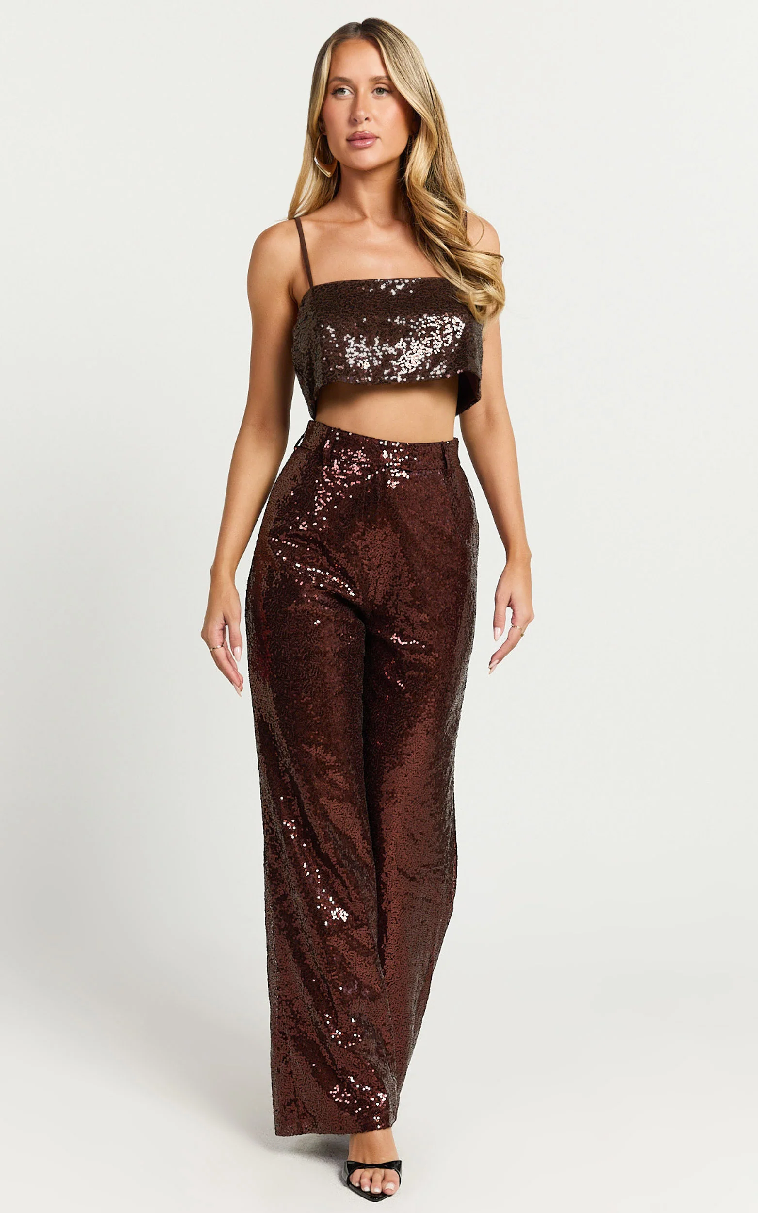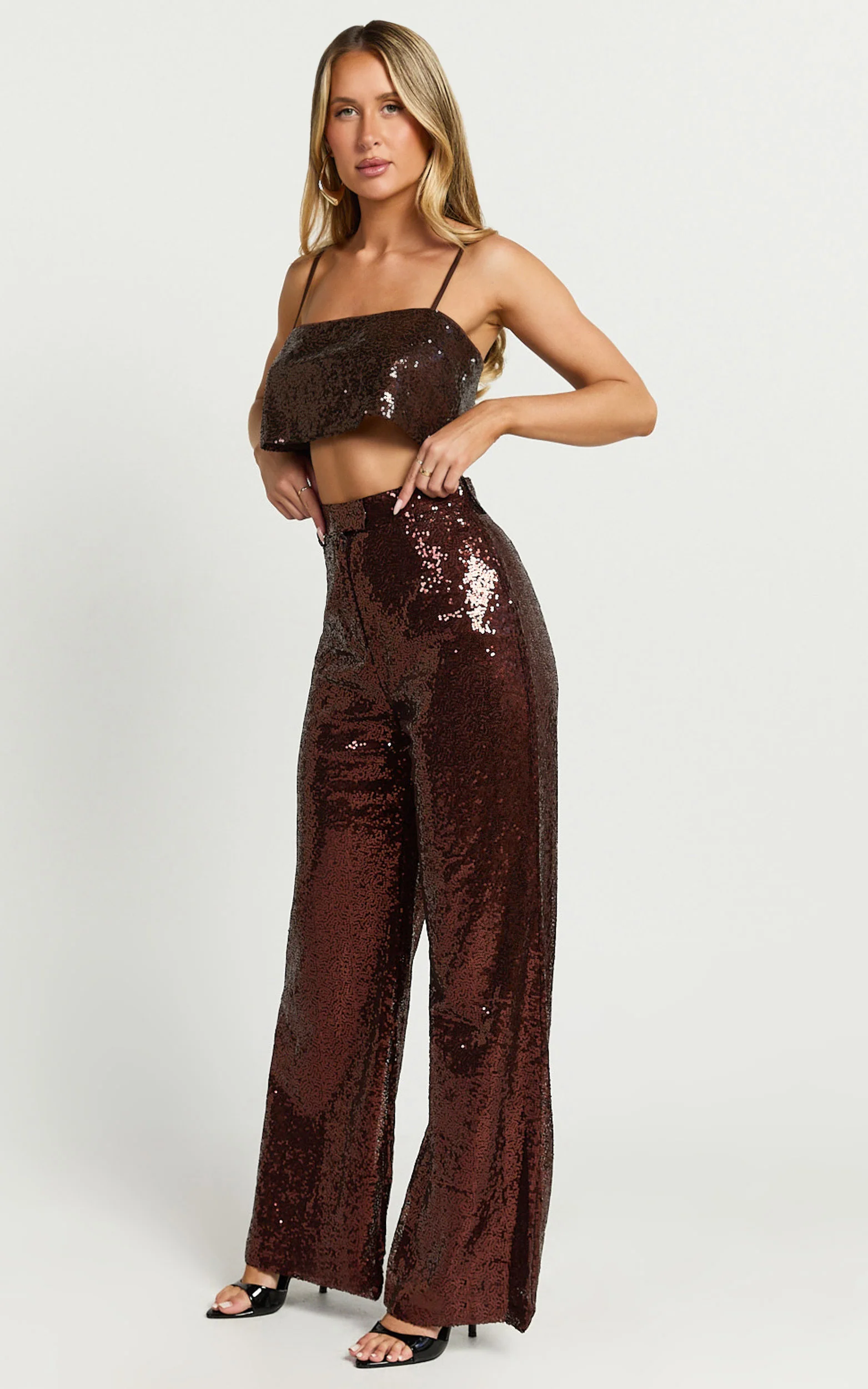 Elswyth Pants - Tailored Wide Leg Sequins Pants in Chocolate