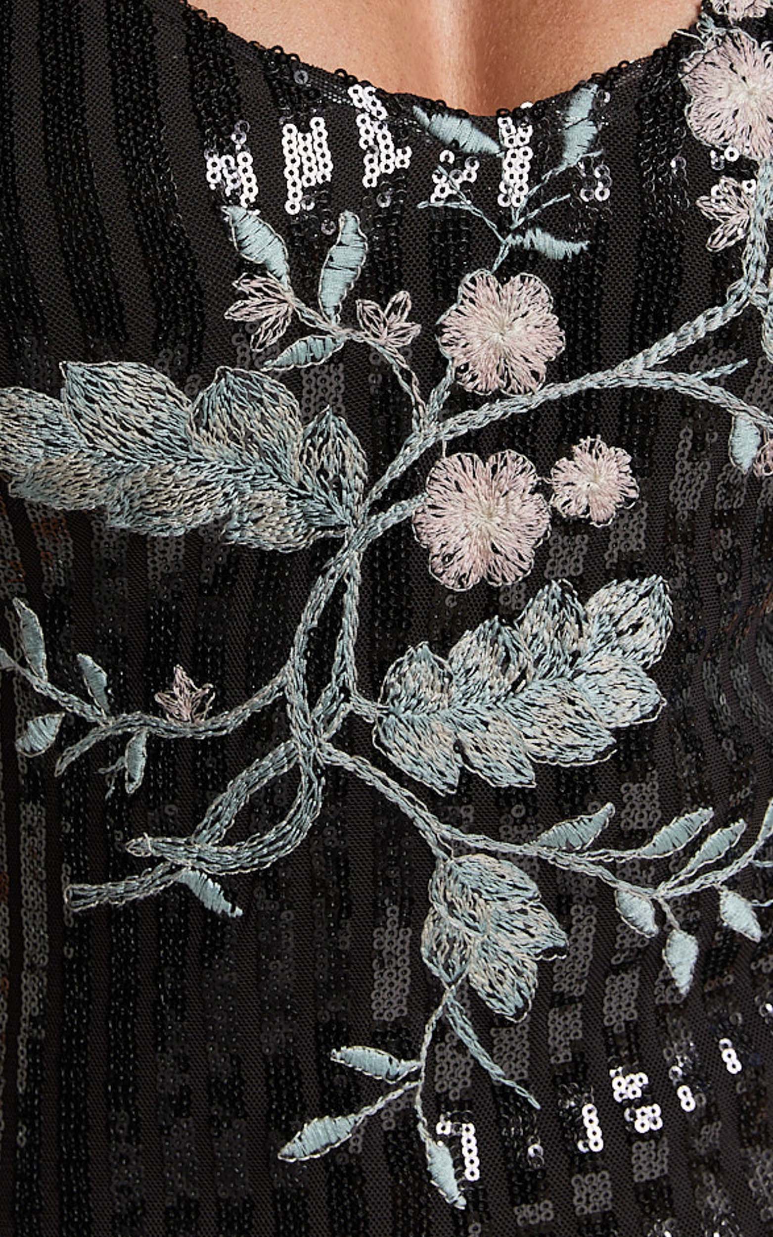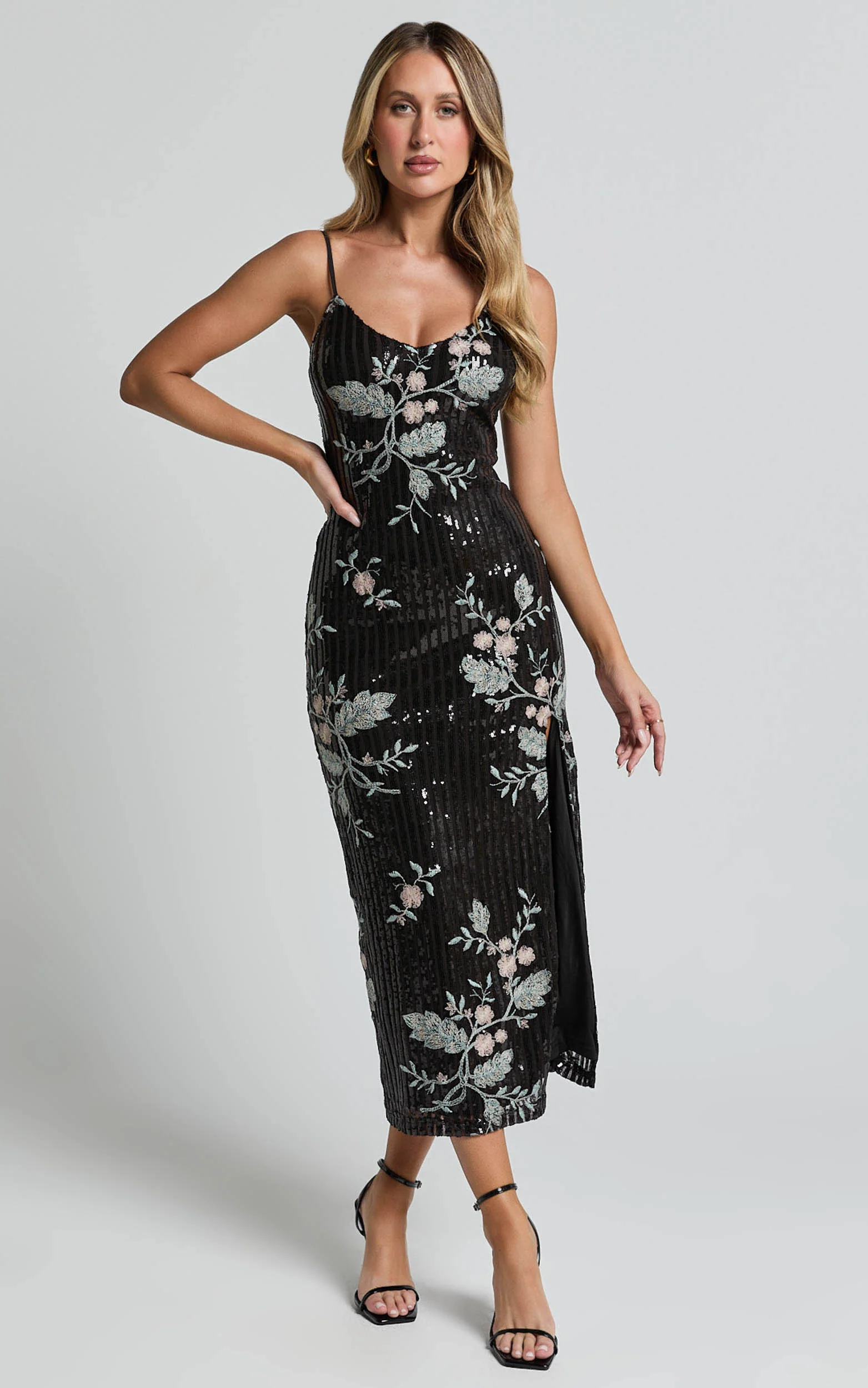 Adrienne Midi Dress - Sequin Embroidered Slip Dress in Black