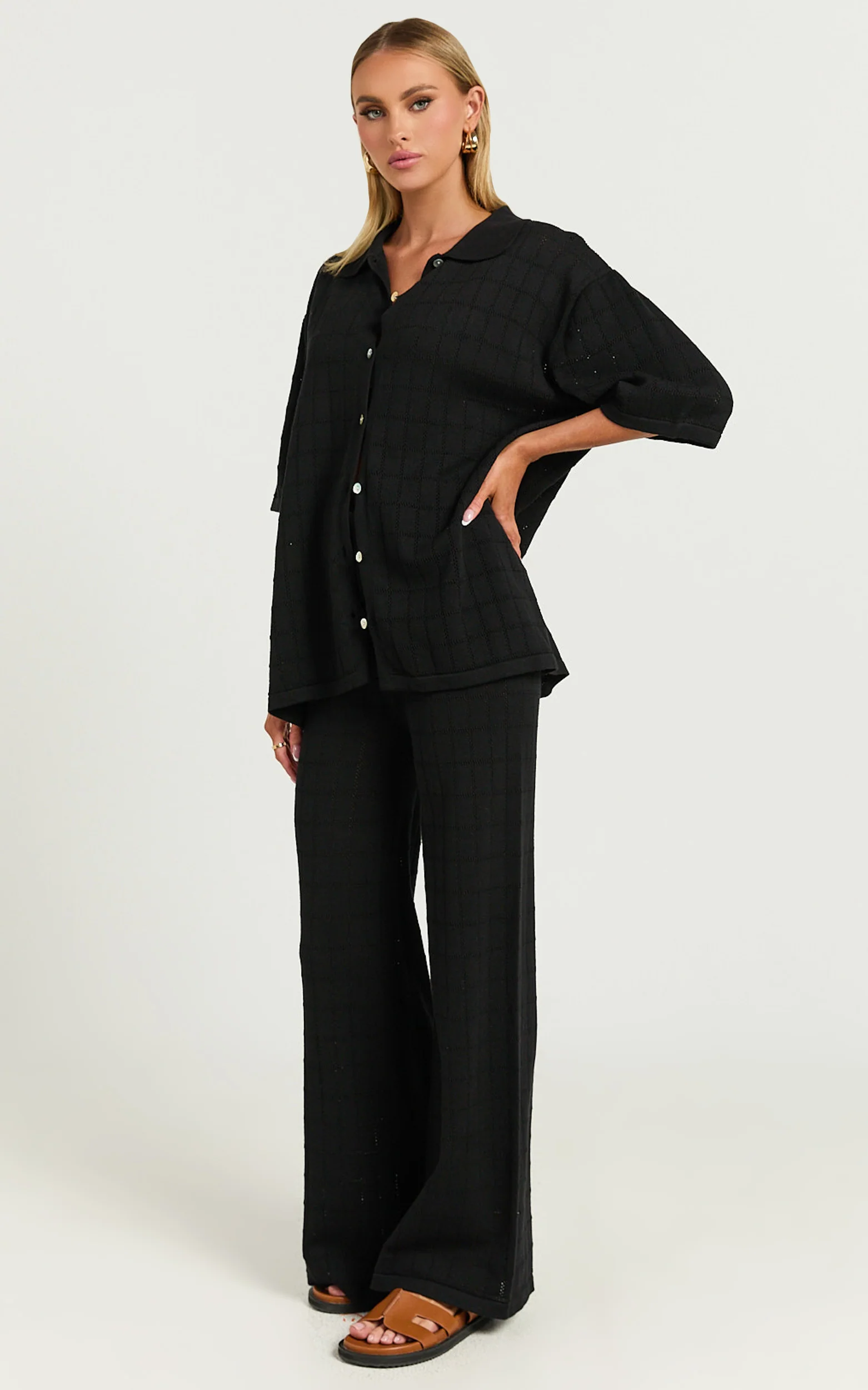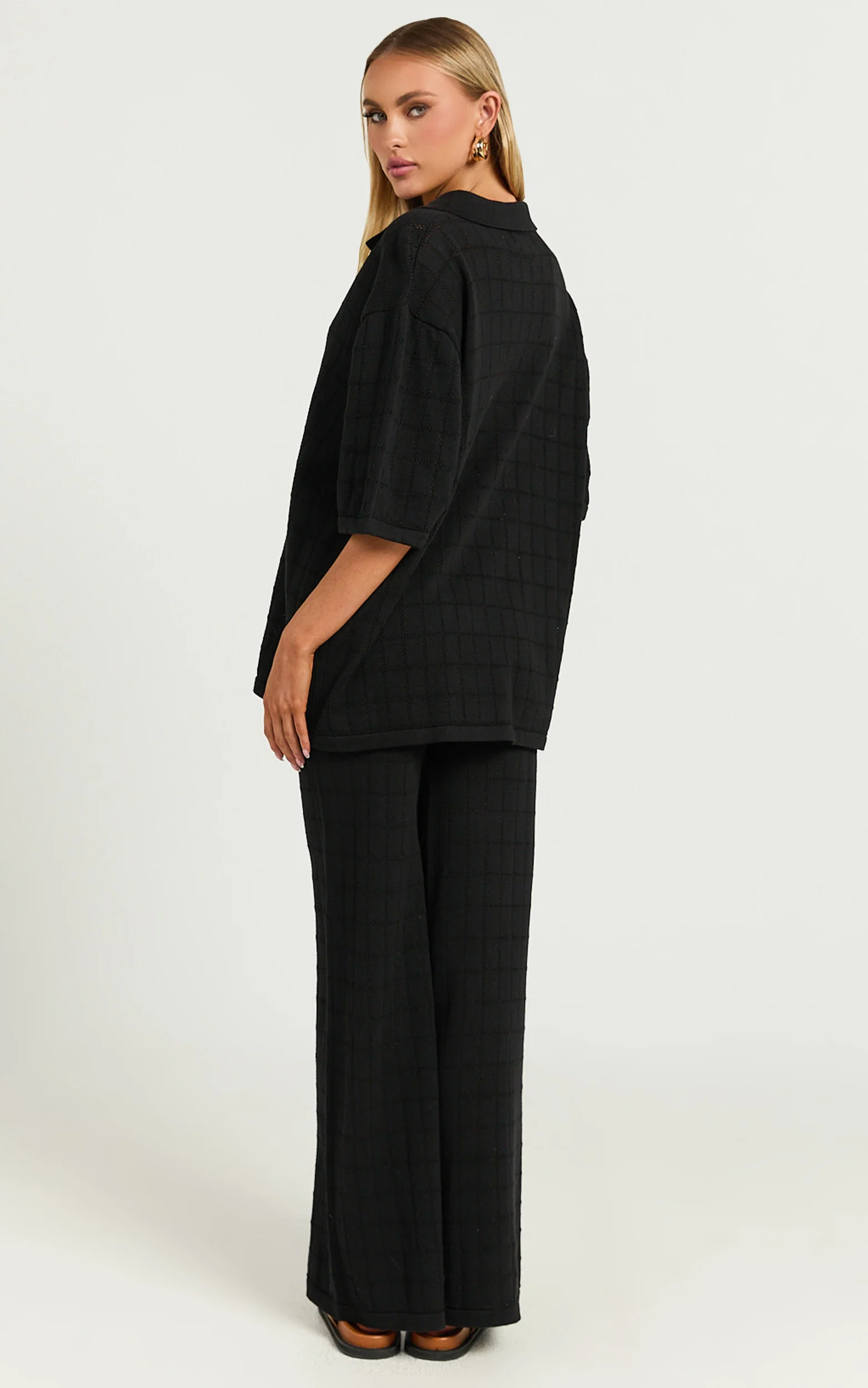 Tommy Two Piece Set - Knit Button Through Top and Pants Two Piece Set in Black