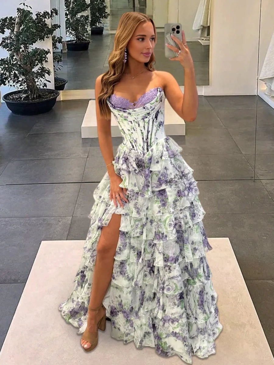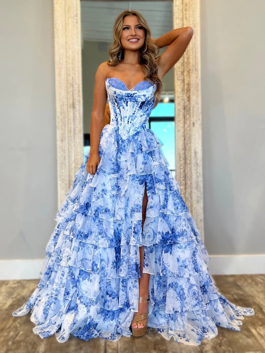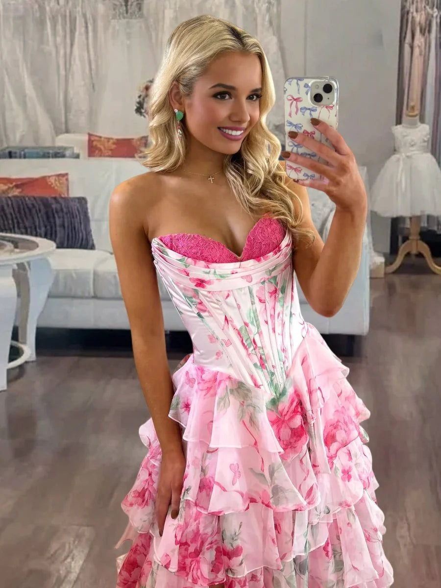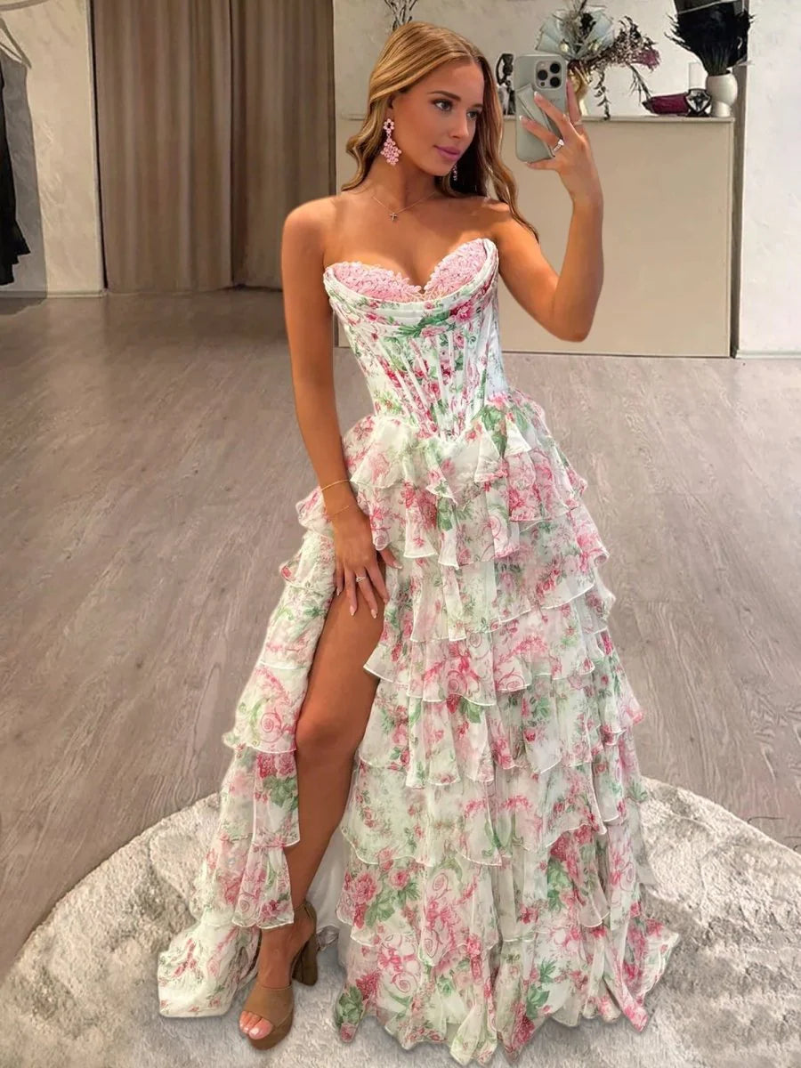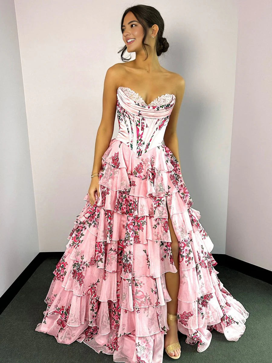 Embrace timeless elegance with this stunning blush strapless prom dress. This dress is designed in a flattering A-line silhouette, it flows beautifully to the floor, offering both grace and movement. The soft chiffon fabric drapes effortlessly, while the strapless neckline adds a touch of sophistication. Intricate floral printed and delicate ruffles along the skirt create a romantic and dreamy look. The dress features a lace-up back for a customizable fit, ensuring comfort and support throughout the evening. This floor-length gown combines delicate charm with modern flair, making it a show-stopping choice for both evening dresses and formal dresses.