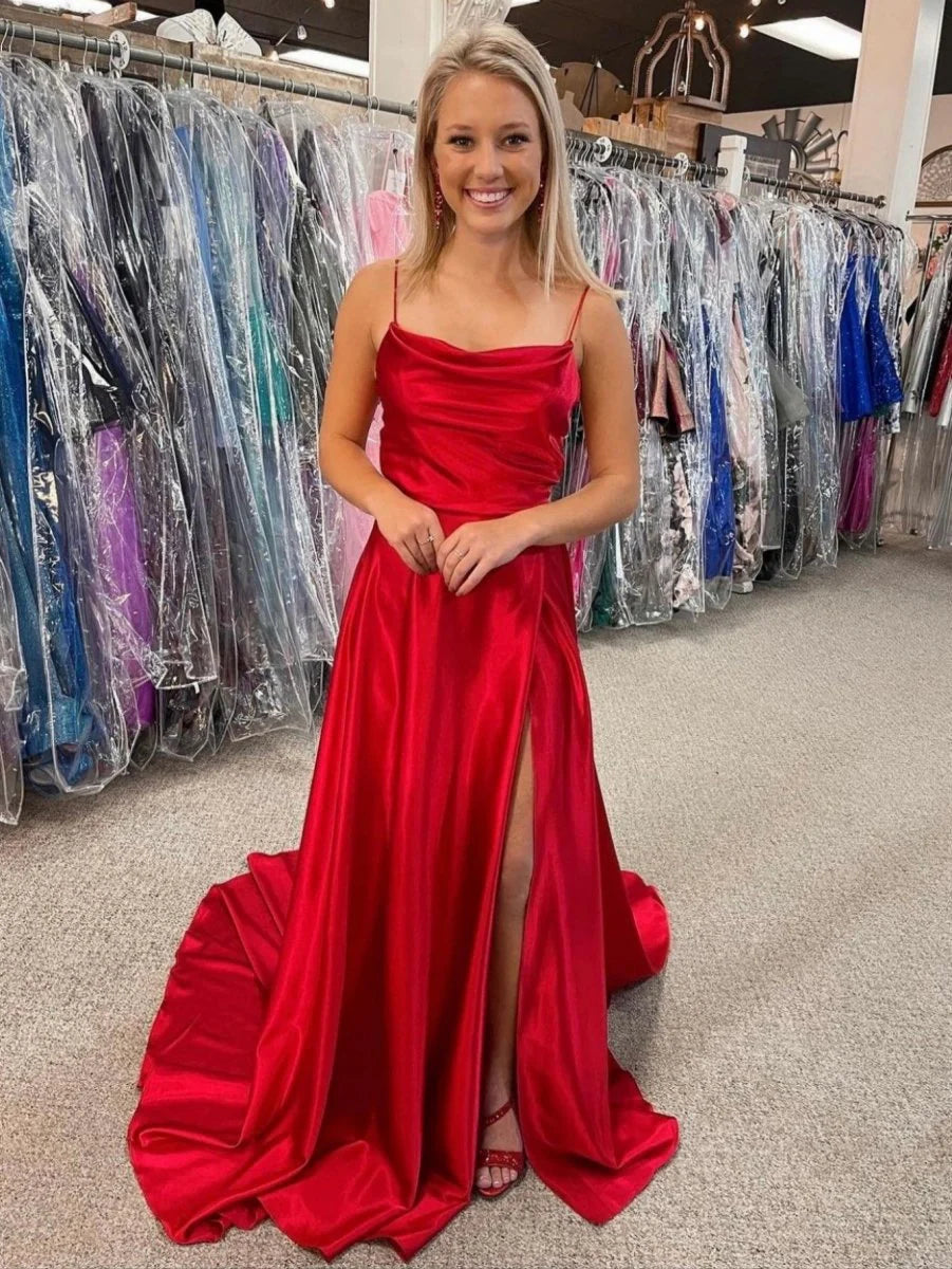 Elevate your evening with "Araya," an A-line stunner that embodies both sophistication and charm. Crafted with lustrous satin in a palette that cascades from vibrant orange and pink to subtle hues of light pink, green, blue, and red, this dress captures the essence of timeless elegance. The spaghetti straps gracefully lead to a cowl neckline, bestowing a touch of vintage allure. As you glide, the sweep train and enticing slit hint at daring, while concealed pockets blend utility with style.