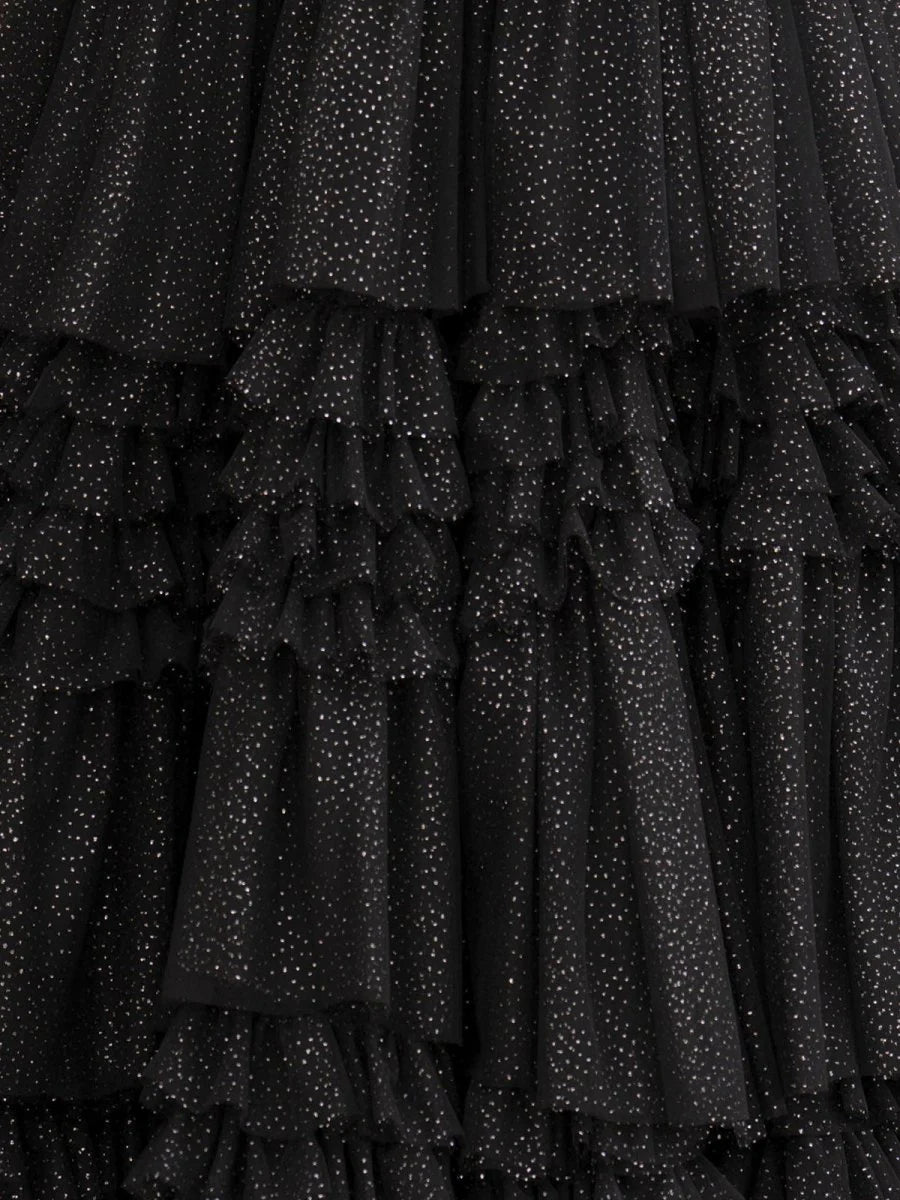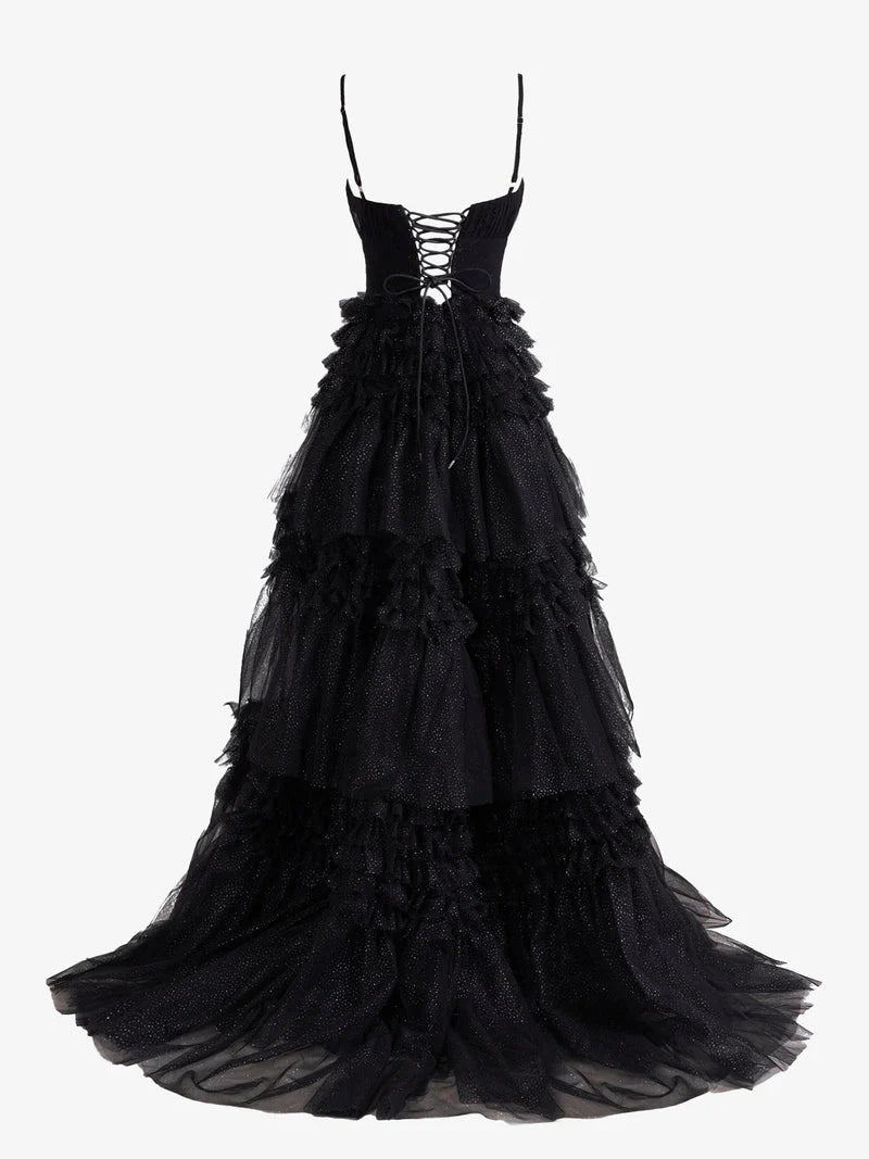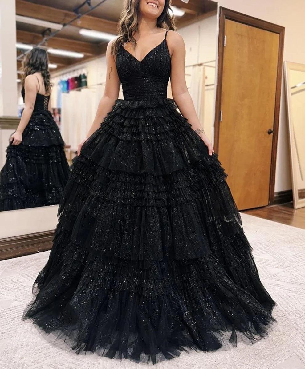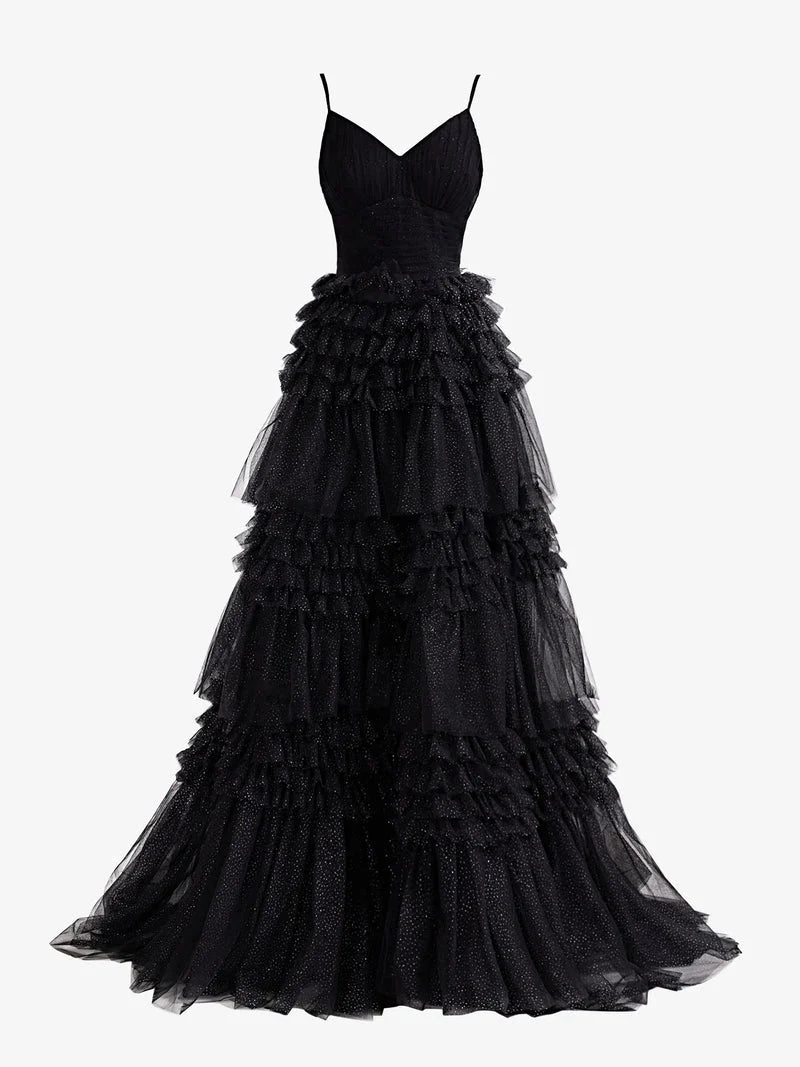 Meet Emerson, where fairytale romance meets high fashion. In this A-line glitter tulle prom dress, you'll take center stage effortlessly. Its floor-length silhouette flows gracefully with every step, accentuated by captivating pleats and multi-tiered ruffles. An ideal choice for evening dresses and formal dresses, with its spaghetti-strap V-neckline adds a dash of allure, perfectly framing your décolletage. As you turn, the lace-up back offers a glimpse of whimsy and makes it easy to achieve a customized fit. Choose Emerson and become the epitome of glam and grace at your next grand event.