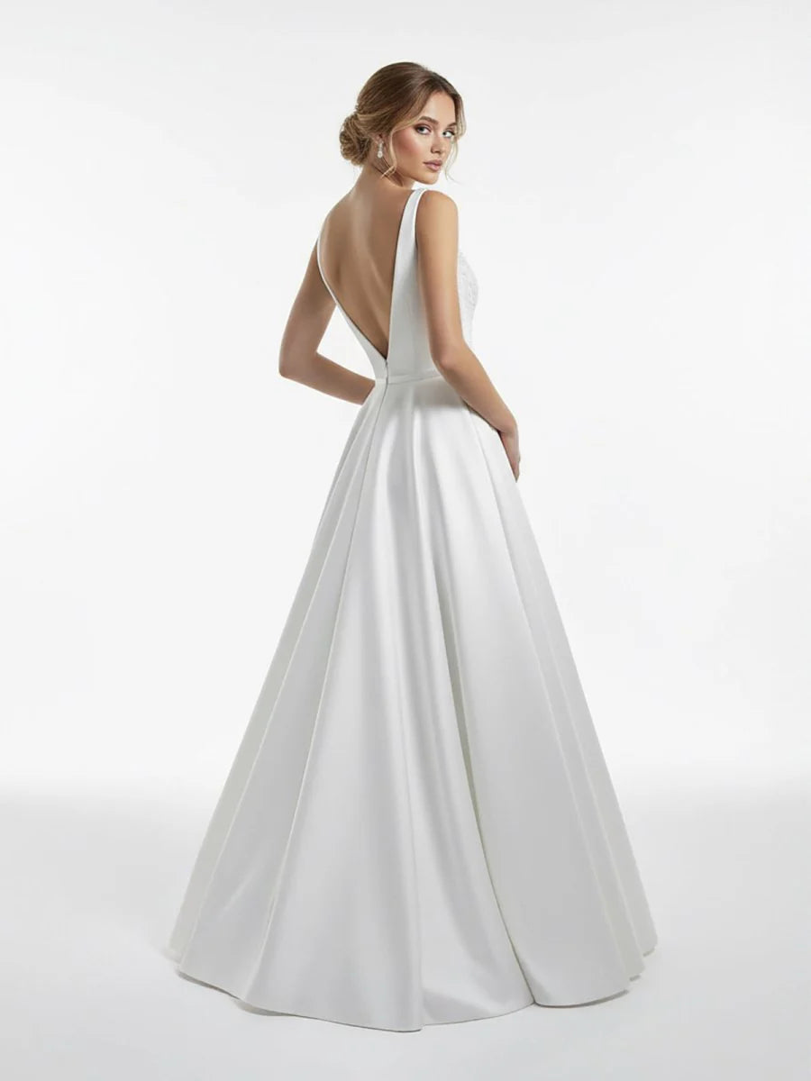 Delicate and romantic, this A-line gown in white or white-nude blends lace and satin for a dreamy bridal look. The illusion V-neck and sleeveless design create a soft, flattering shape, while the appliquéd details, pleats, and illusion corset bodice add subtle texture and elegance. Its sweep train flows beautifully as you move, and the zipper back ensures a comfortable fit. Perfect for a timeless and unforgettable wedding day.