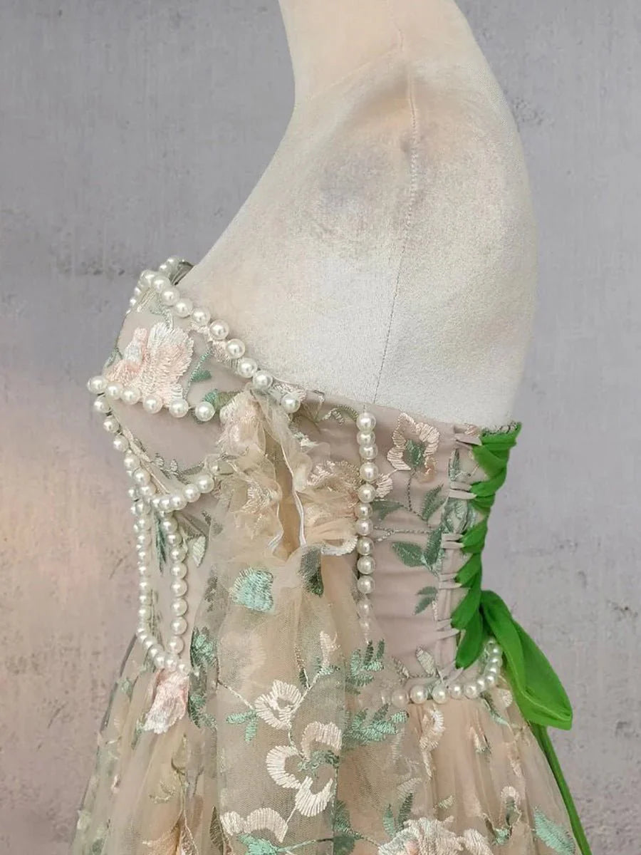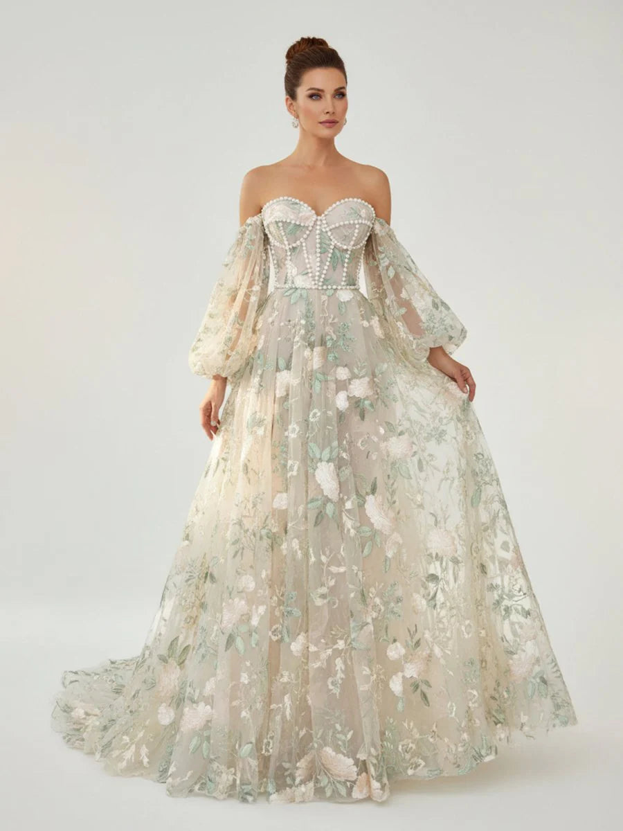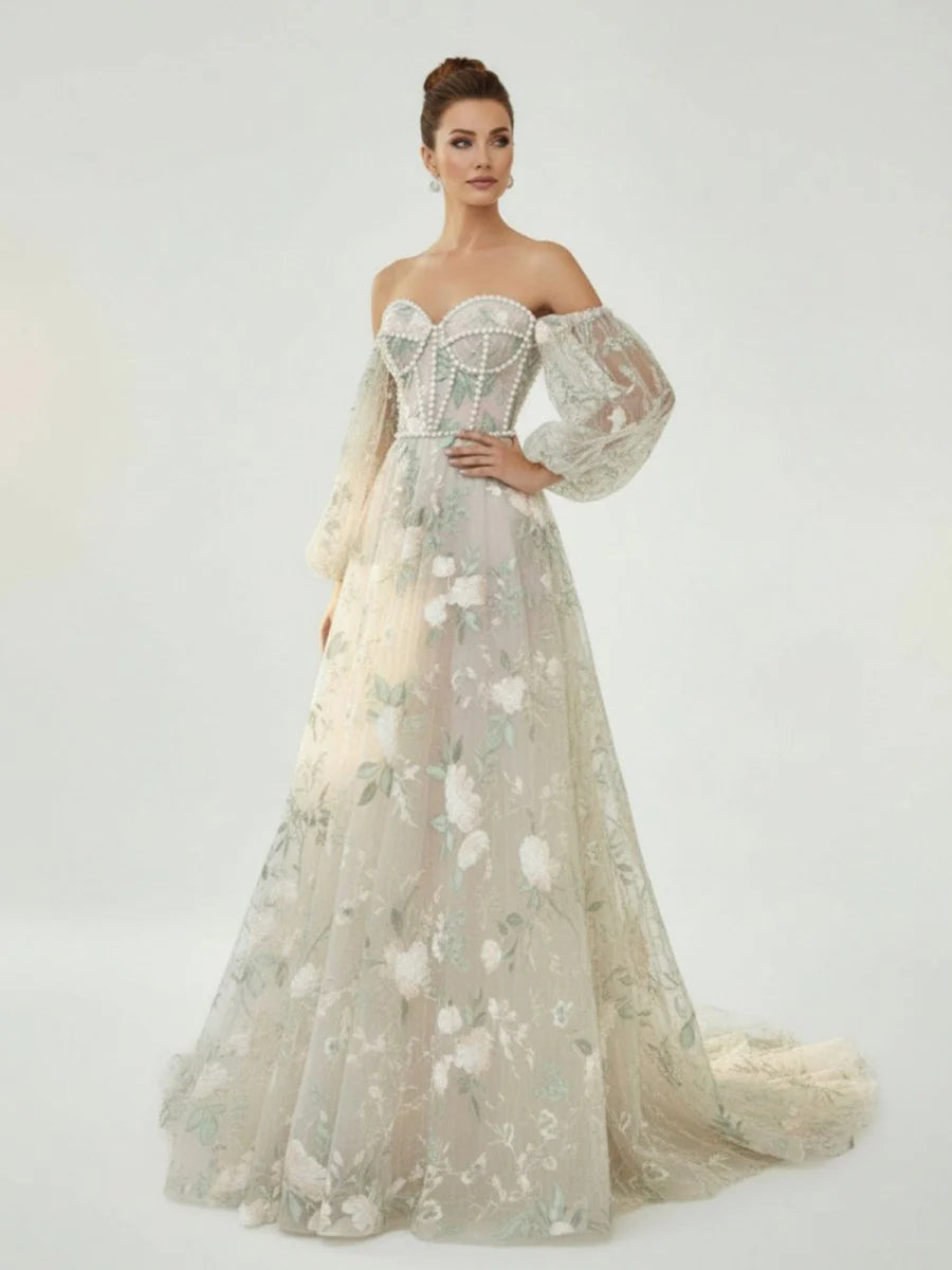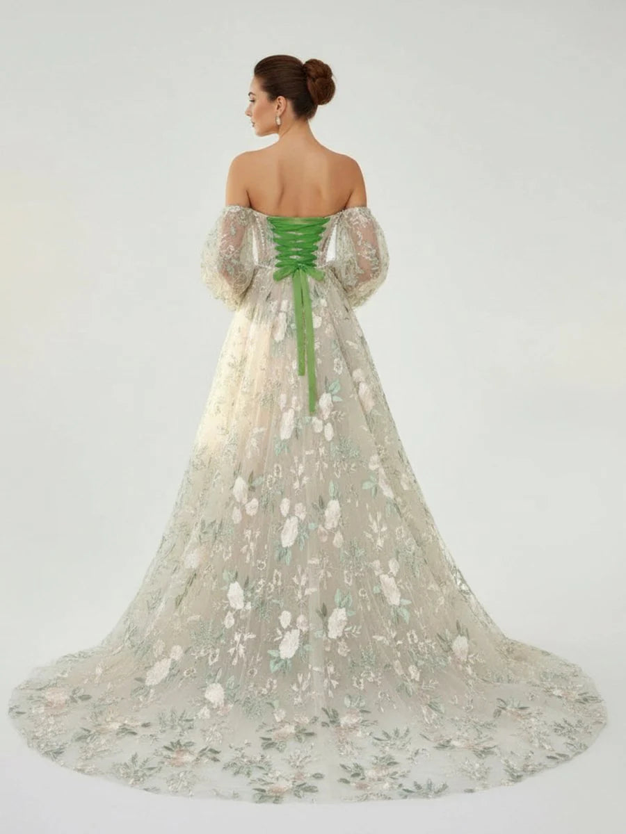 Soft and enchanting, this light green A-line tulle gown is perfect for a whimsical bridal look. The off-the-shoulder neckline and long sleeves create a romantic, flattering silhouette, while lace appliqués and delicate pearl details add a touch of elegance and charm. The sweep train flows beautifully as you move, and the lace-up back ensures a perfect fit. A dreamy choice for a memorable wedding day.