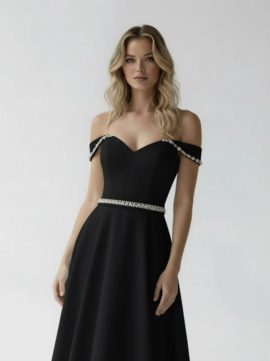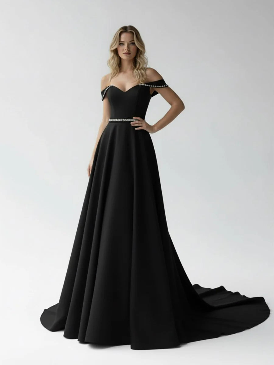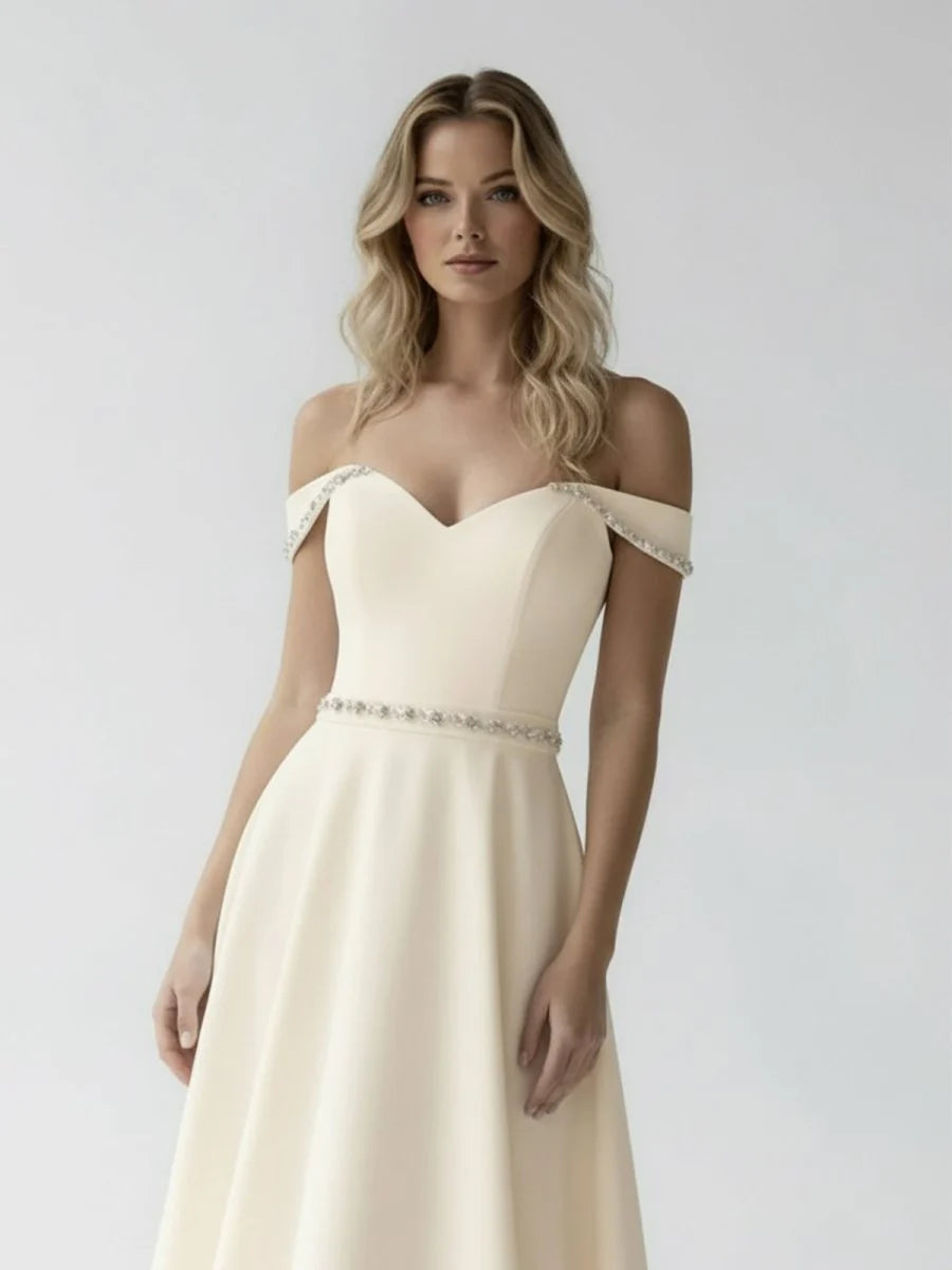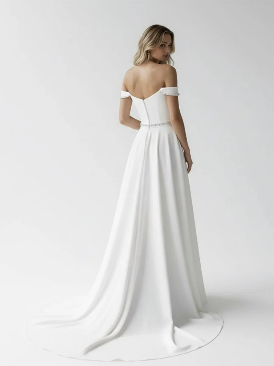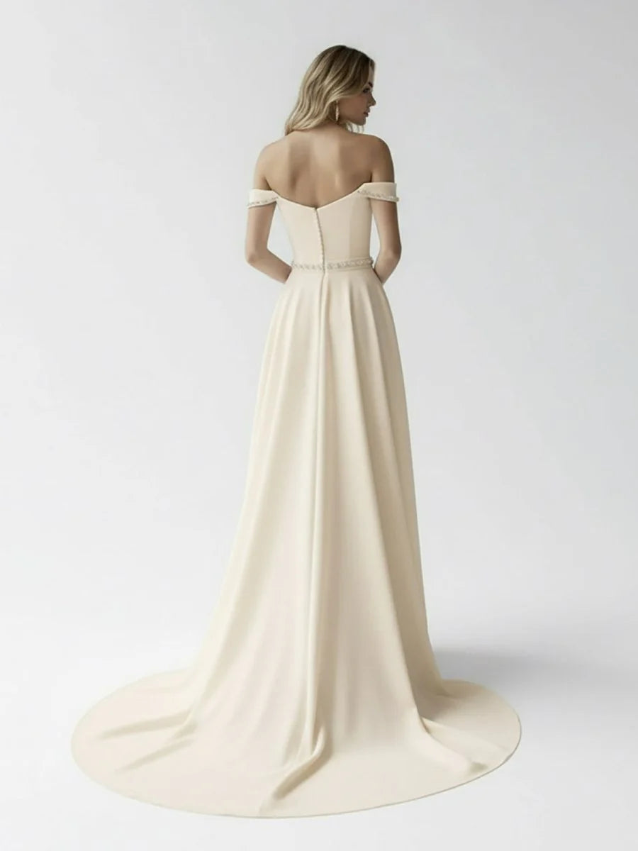 This breathtaking A-line bridal gown combines classic elegance with a touch of modern luxury, making it perfect for the bride who wants to shine on her special day. The A-line silhouette gently flares from the waist, creating a flattering, feminine shape that extends into a sweeping train, adding drama and movement as you walk. The off-the-shoulder neckline is a striking and romantic feature, beautifully framing the shoulders and collarbones, while adding a hint of sensuality and timeless grace. The sleeveless design enhances the gown's delicate elegance, allowing for a fresh, airy feel that’s both chic and comfortable. The covered button back adds a vintage-inspired touch, lending the gown a sense of classic beauty. Subtle beadings throughout the gown embellish the fabric, catching the light and adding just the right amount of sparkle without overwhelming the design. This bridal gown is perfect for the bride who desires understated luxury with a refined and graceful silhouette, ensuring she feels like the epitome of beauty as she walks down the aisle.