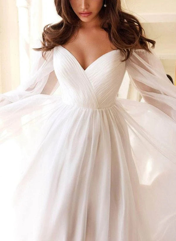 This A-Line style gown, crafted from flowing chiffon fabric, is a beautiful and elegant choice for any formal event. The soft, lightweight chiffon gives the dress an airy, graceful movement, while the rich, classic colors of White, Black, Champagne, and Ivory make it suitable for a variety of occasions, from weddings to galas. The off-the-shoulder neckline adds a romantic and sophisticated touch, highlighting the shoulders and collarbones with subtle elegance. Long sleeves offer a refined, timeless look, perfect for cooler weather or those who prefer a bit more coverage. The back of the dress features a zipper closure for ease of wear and a smooth, sleek finish. The floor-length design adds drama and grandeur, giving the dress a stunning silhouette that gracefully falls to the floor. The ruffled embellishments enhance the gown’s feminine, romantic appeal, creating soft textures and a visually interesting contrast to the smooth, flowing chiffon fabric. Ideal for someone looking for a blend of classic elegance with modern, subtle details, this A-Line chiffon dress is a perfect choice for anyone who wants to feel like royalty while enjoying comfort and effortless beauty.