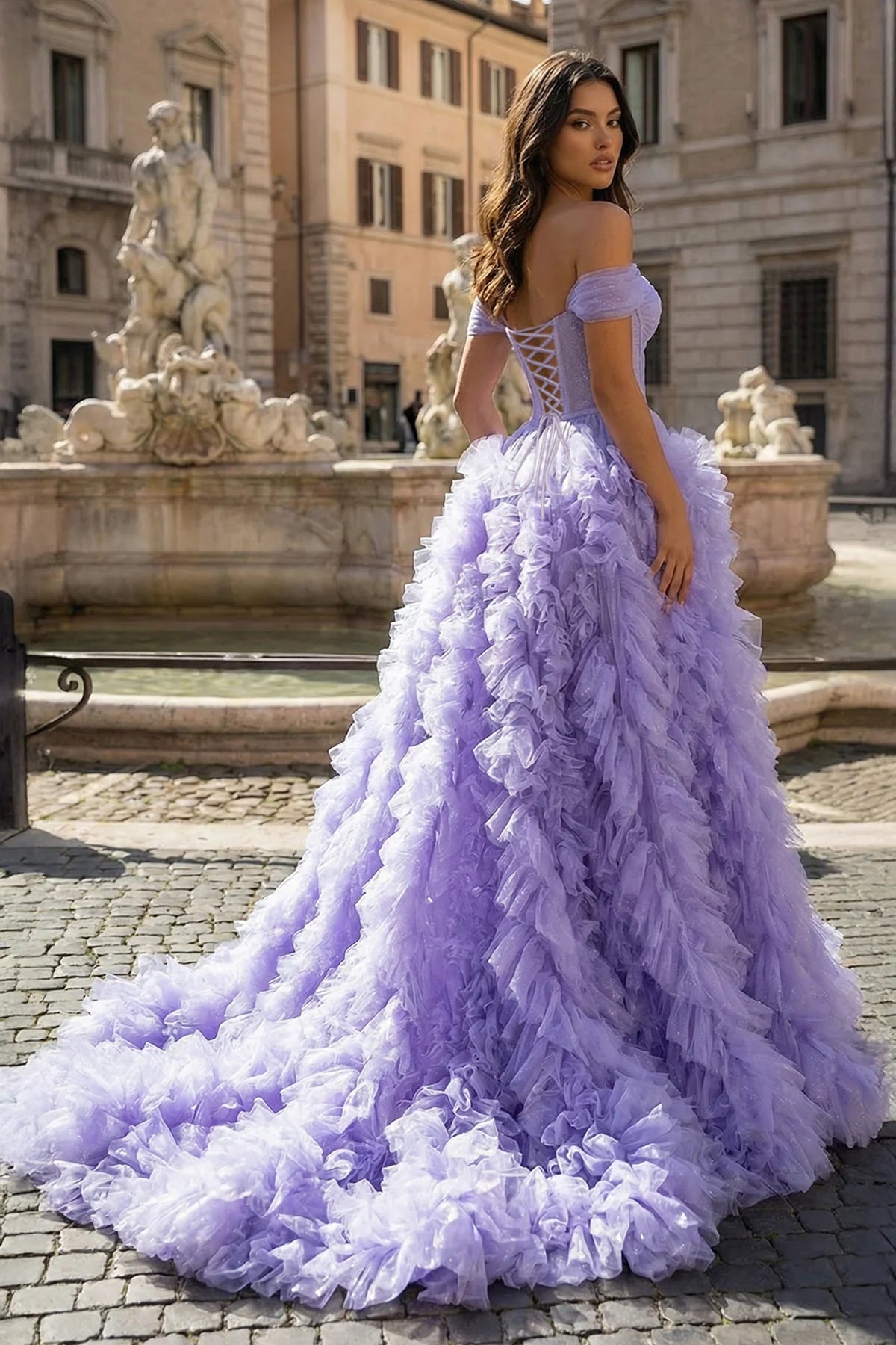 Step into a world of fairytale elegance with "Kenia", a masterpiece that captures the essence of timeless beauty and contemporary panache. Delicately crafted in the ever-charming A-line silhouette, this gown wraps you in the ethereal touch of tulle fabric, swaying gracefully with every move. A show-stopping feature, the off-the-shoulder neckline is both regal and romantic, drawing eyes to the gentle curve of your shoulders. Every layer of the multi-tiered ruffled skirt dances independently, creating a mesmerizing cascade, while the pleats on the illusion corset bodice add a touch of sophistication. But Kenia's audacity shines through with the daring slit, a modern twist to the tale.