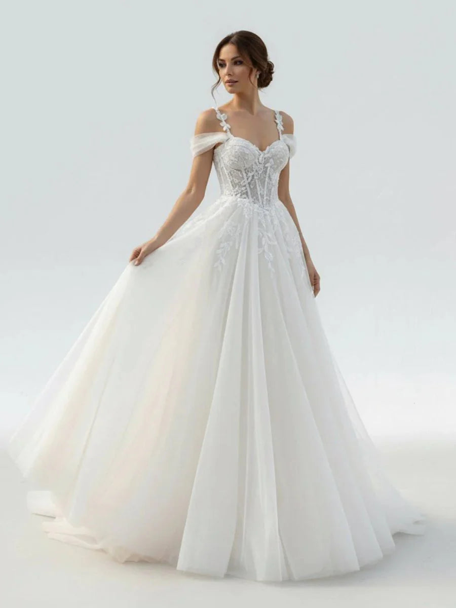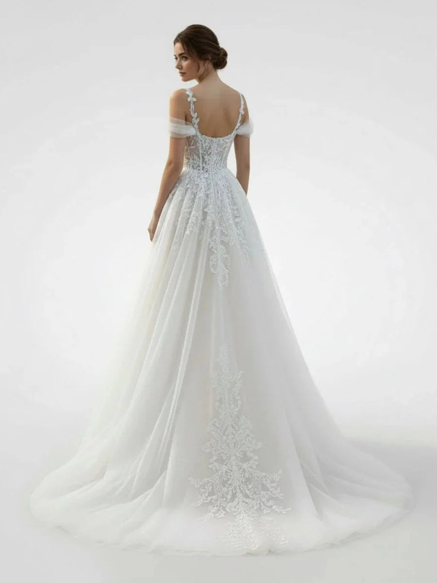 Elodika, the ultimate wedding dress for the romantic bride. Crafted from layers of ethereal tulle with intricate lace appliques, this A-line gown creates a dreamy silhouette that flatters every figure. Elegance and vintage charm meet in this timeless masterpiece, making your wedding dreams come true.