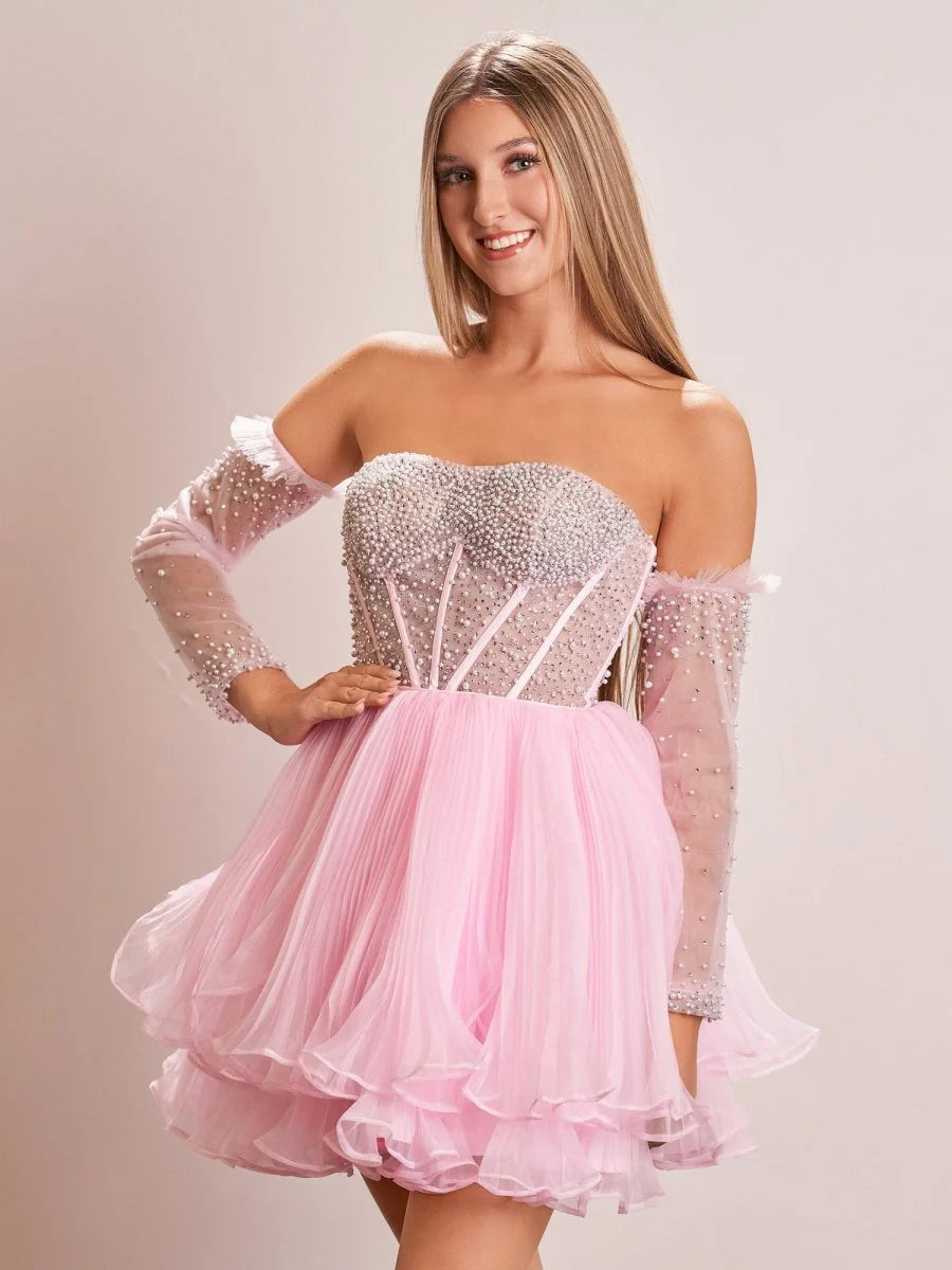 Enhance your look with Briena's A-Line Pink Sweetheart Ruffled Short Homecoming Dress from KissProm. The dress features a delightful A-line silhouette and is crafted from delicate organza fabric, ensuring a graceful flow with every step. The sweetheart neckline adds a touch of romance, while the removable pearl sleeves offer a customizable look. The ruffled details create a playful yet sophisticated appearance, while the lace-up provides a customizable fit for ultimate comfort and support. This dress promises to make your homecoming or special event truly unforgettable.
