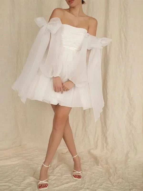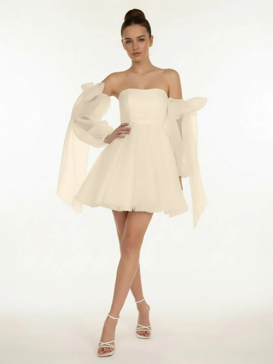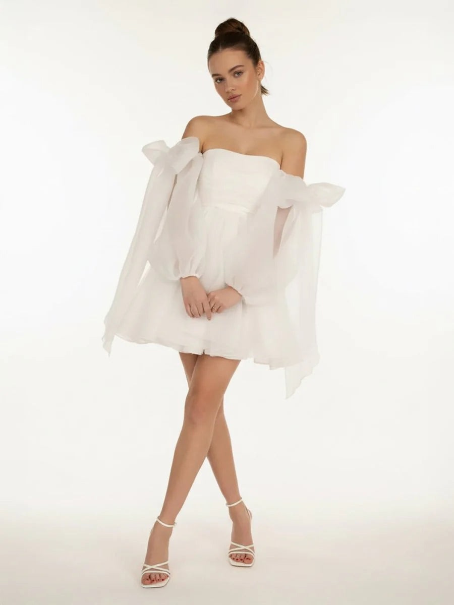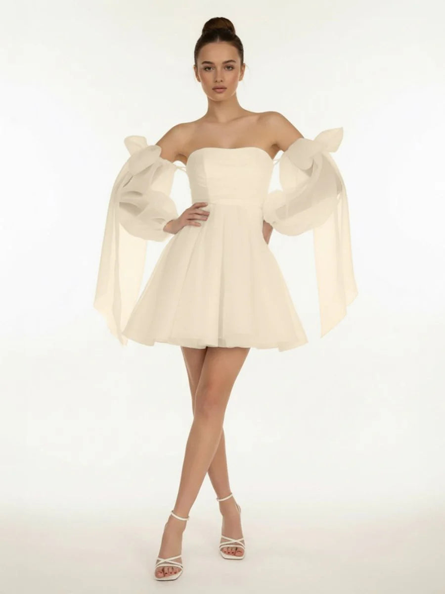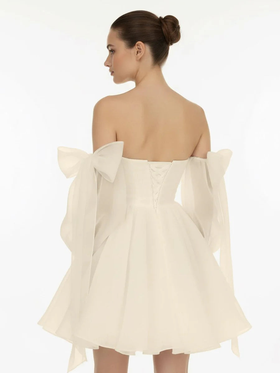 Ronnie, a charming short wedding dress, crafted in delicate organza fabric, this dress features an A-line silhouette that flatters every figure. It is modern elegance meets timeless charm. The strapless neckline and long sleeves add a touch of romance, while the lace-up back ensures a perfect fit. Adorned with playful bows, this dress in classic white is ideal for the bride seeking a blend of sophistication and whimsy. Ideal for garden or city celebrations, "Ronnie" ensures you shine on your special day.