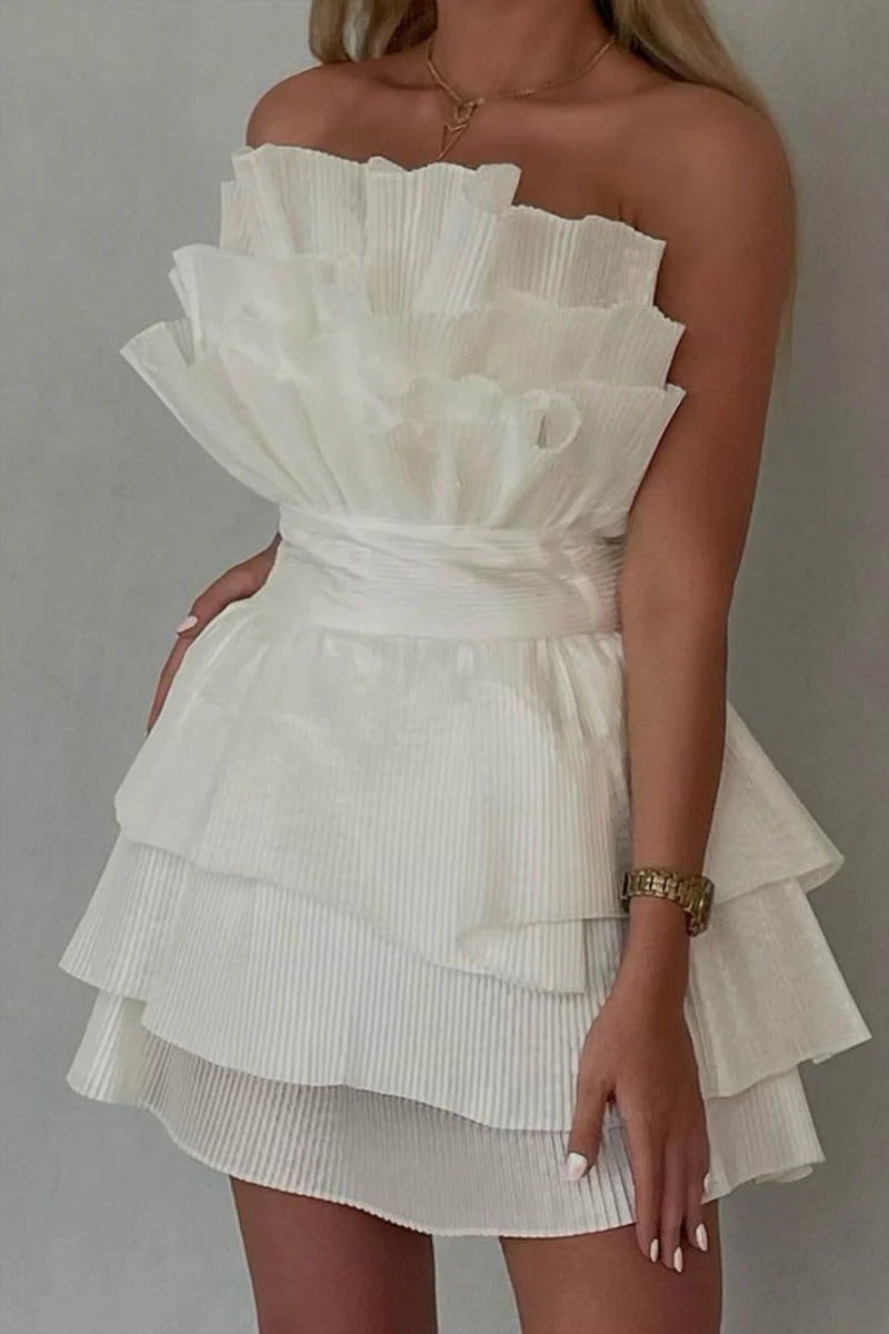 Float into any occasion with this delicate white A-line mini dress. Crafted from airy chiffon, it features a strapless neckline and sleeveless design for a light, graceful silhouette. The lace-up back allows for a perfect fit, while tiered ruffles cascade playfully, adding movement and charm. Ideal for homecoming, cocktail parties, or any event where effortless elegance is a must.