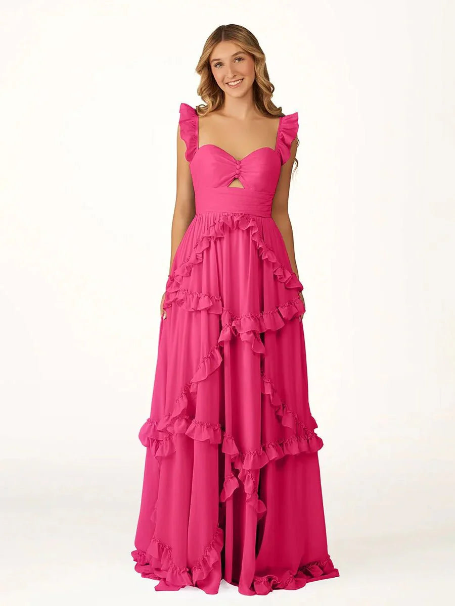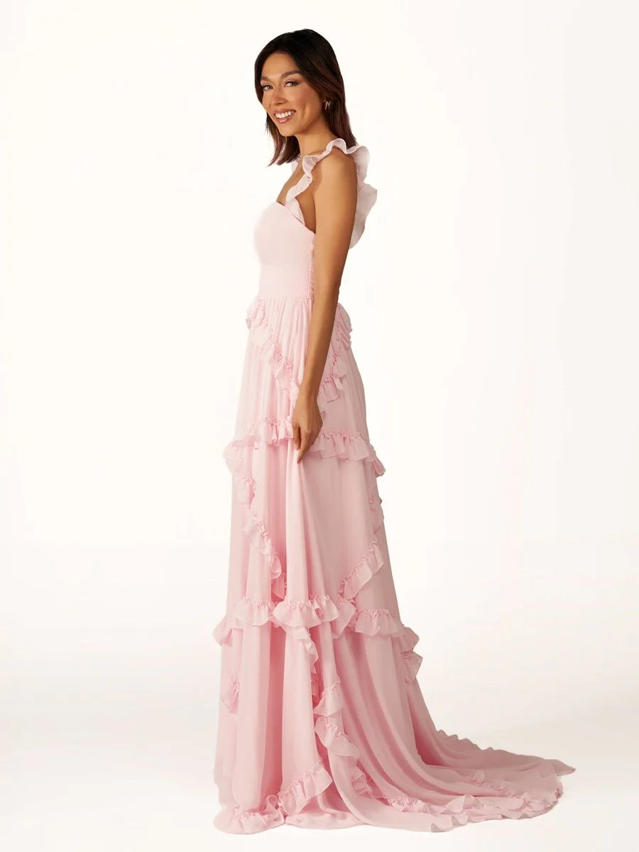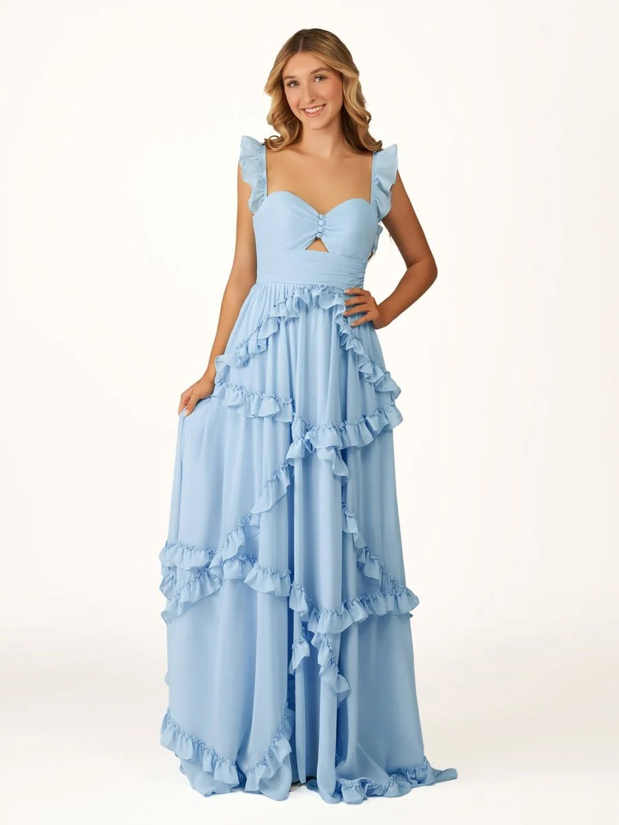 This enchanting A-line gown in soft sky blue chiffon is the epitome of grace and elegance. This dress is a perfect choice for both evening dresses and formal dresses, with its delicate sweetheart neckline that beautifully frames the collarbone, along with a sleeveless design that adds a touch of modern simplicity. Flowing down into a sweep-train, the gown offers an ethereal quality with its light, airy chiffon fabric that moves gracefully with every step. The open back adds a romantic touch and ensures a perfect fit. Ruffle embellishments cascade elegantly along the skirt, adding texture and movement, making this gown an ideal choice for a dreamy, refined look at any special occasion.