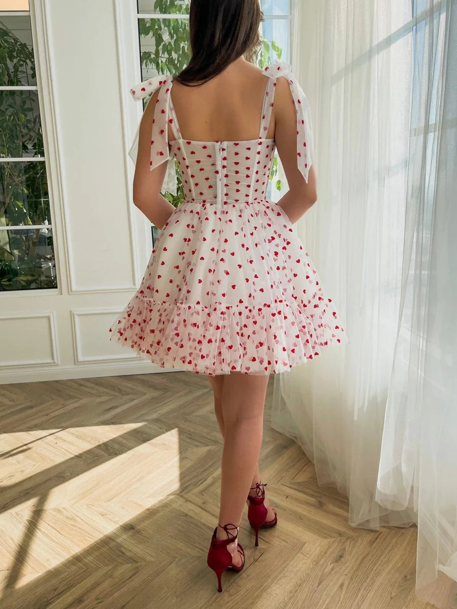 Introducing Macie, a youthful blend of romance and whimsy. Fashioned in a delicate A-line silhouette, this dress showcases the playful charm of pink, heart-shaped tulle fabric. Its sweetheart neckline frames your face, exuding an aura of innocent allure. The bow knot, paired with tailored pleats, offers a flirty twist to the classic style. Not to be overshadowed, the ruffles add a delightful bounce with every step you take. And in a practical twist, Macie's side pockets let you stash little essentials. Its short length ensures your dance moves remain unrestricted, while the zipper back guarantees a snug fit.