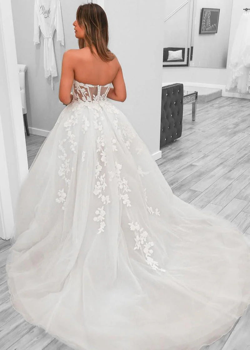 This enchanting bridal gown combines delicate sophistication with modern flair, creating a stunning and unforgettable look for the bride who desires both elegance and a touch of boldness. The A-line silhouette gently flows from the waist, offering a flattering shape that gracefully extends into a sweep train, adding movement and a sense of grandeur. The sweetheart neckline beautifully frames the bust, creating a soft and romantic effect that highlights the bride’s natural beauty. Sleeveless and graceful, the gown offers both comfort and elegance, allowing for freedom of movement throughout the day. The covered button back adds a classic, vintage-inspired touch, enhancing the gown's refined sophistication. The slit detail introduces a bold and modern element, allowing for ease of movement while offering a daring glimpse of the legs. Appliqué embellishments add intricate, textured beauty, elevating the gown's design with delicate artistry. This bridal gown is ideal for the bride who seeks a blend of classic elegance and contemporary style, ensuring she radiates both beauty and confidence on her wedding day.