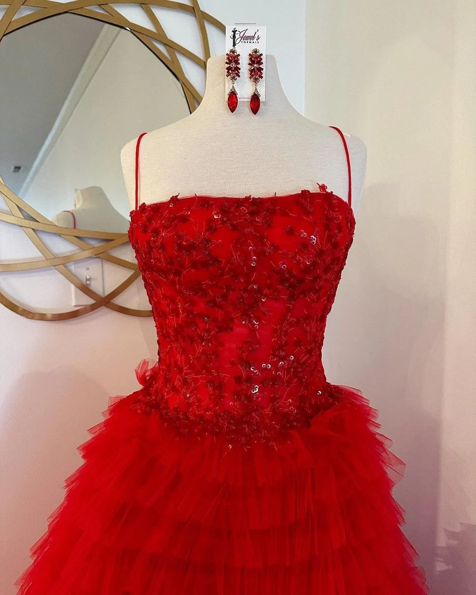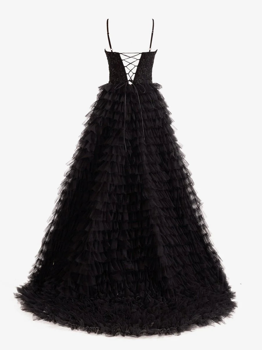 Bask in the glamorous shimmer of the "Jordan", a stunning A-line tiered sequins tulle long prom dress. Crafted from luxurious tulle fabric and beautifully adorned with lace appliques and sequins, the Jordan dress will leave a trail of awe-struck admirers. Its straight-across neckline flatters all body types while the floor-length skirt with a court train adds a dash of royal flair to your prom night. The tiered ruffles add an extra layer of sophistication and a contemporary twist to the classic A-line silhouette. An ideal choice for both evening dresses and formal dresses, with its unexpected slit adding a sultry touch to this enchanting ensemble, making it an ideal choice for the modern, fashion-forward prom-goer.