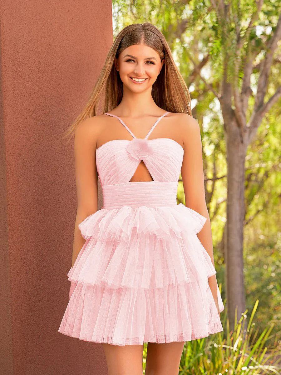 Elevate your style with Queena's vibrant A-line Tulle Orange Keyhole Halter Short Homecoming Dress. Expertly crafted with soft tulle fabric, this dress boasts a striking hue, a halter neckline, and charming details like ruffles, pleats, and handmade flowers. Perfect for homecoming, parties, and more, this dress is sure to make you stand out in any crowd.