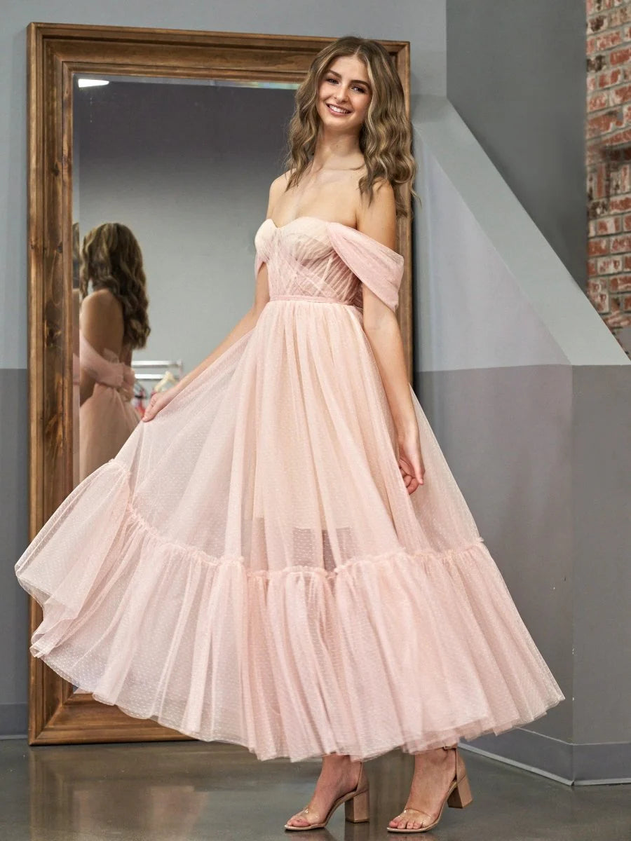 Step into the room and captivate all eyes with our Nova dress. With a flattering A-line silhouette, it embodies both grace and charm. The delicate dotted tulle fabric adds a touch of magic, ensuring a fairy-tale entrance to your homecoming event. The sweetheart neckline flatters your figure while the off-the-shoulder straps add a hint of romantic allure. Adorned with pleats on the bodice and cascading ruffles on the skirt, Nova is an artwork in itself.