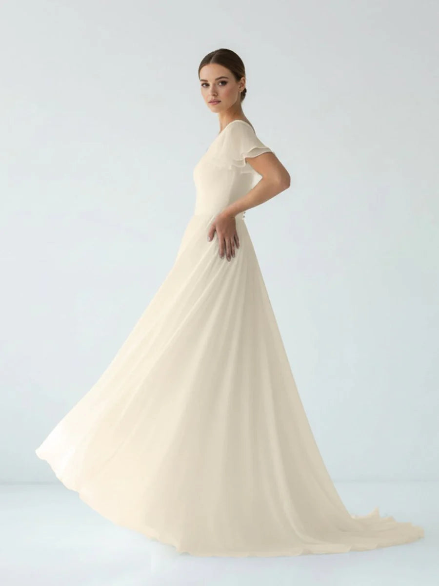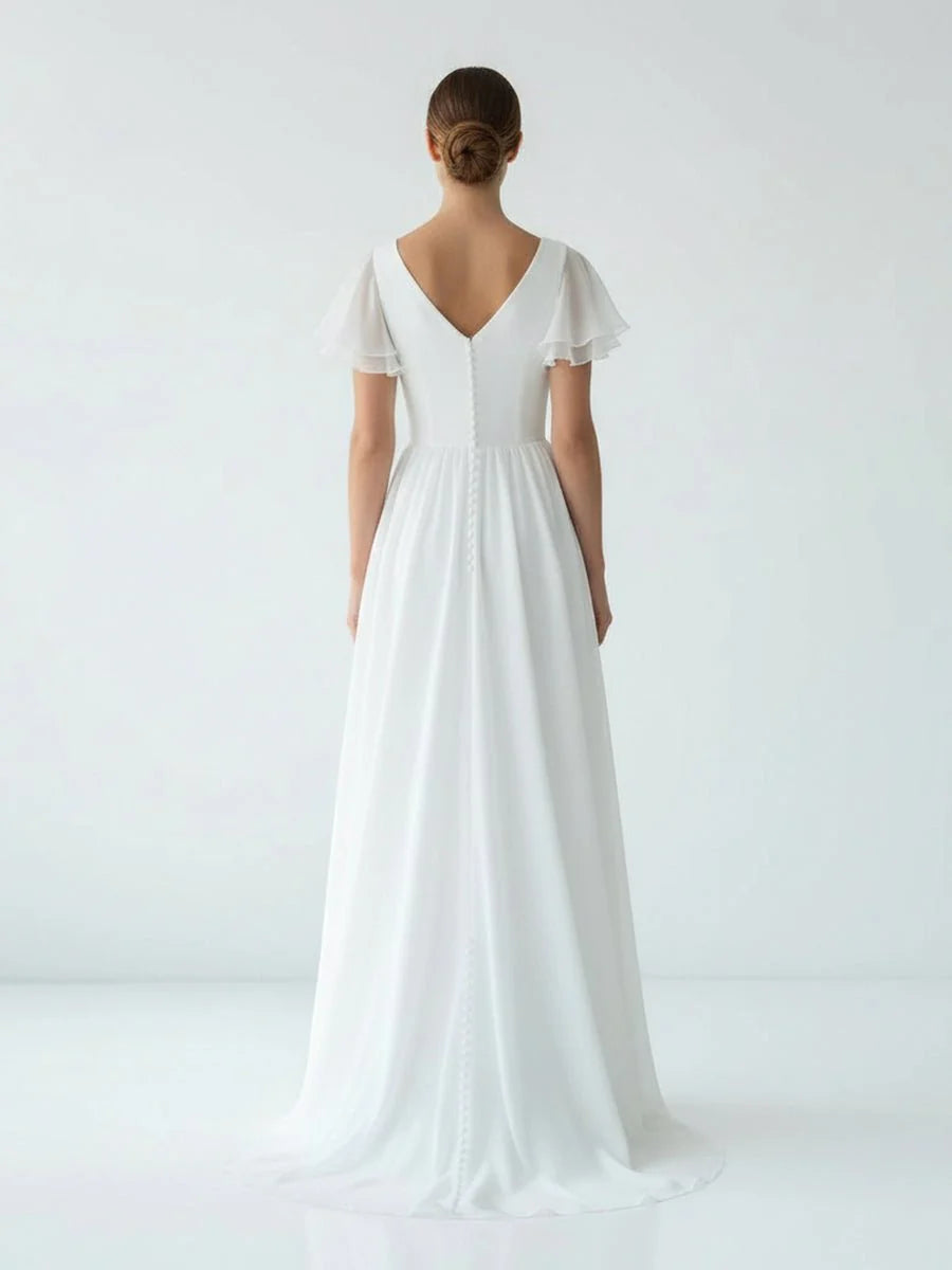 Embrace timeless elegance with the Liora A-Line V-neck Chiffon Floor-length Wedding Dress. This exquisite dress, designed with an A-line silhouette, beautifully flatters all body types, while the luxurious chiffon fabric drapes gracefully to the floor, ending in a sweep train for a touch of sophistication. The ruffle embellishments cascade down the skirt, adding texture and movement, ensuring you look stunning from every angle.