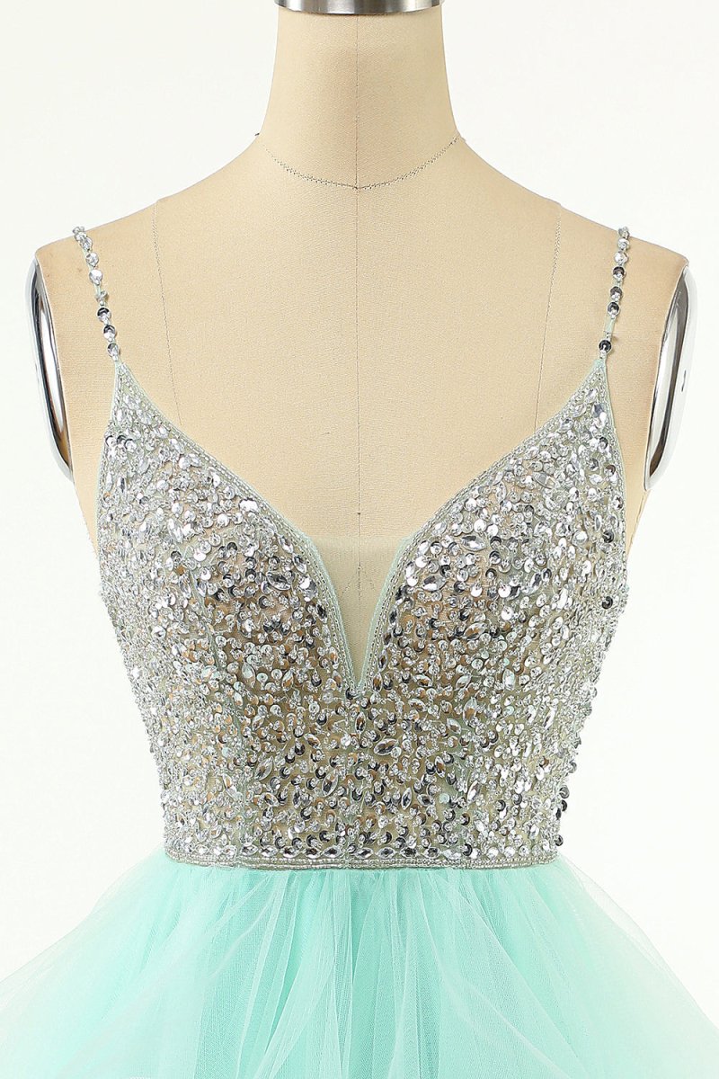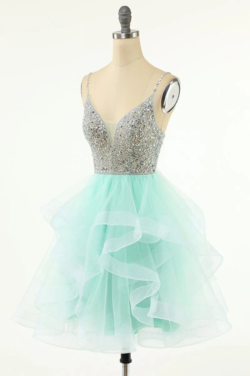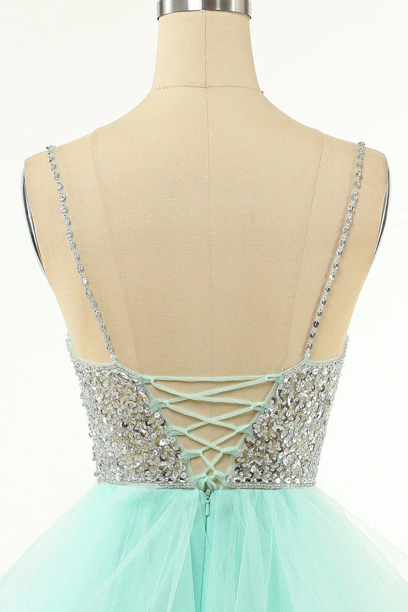 Immerse yourself in the enchantment of the "Amelia" - A Line V Neck Tulle Homecoming Dress, an embodiment of sheer grace and sophistication. Exquisite in its design, the dress features a tulle horse-hair ruffled skirt that elegantly cascades, complementing the luminescence of its sequin top. Each stride you take in this masterpiece exudes an ethereal charm, capturing the very essence of a dreamy evening. The plunging V neckline, enhanced with beaded detailing, showcases a delicate balance of allure and modesty. The dainty beaded spaghetti straps lead to a sensual lace-up back, promising a fit that's as perfect as your evening. To finish, the beaded waistline accentuates your silhouette, ensuring you're the star of every glance and the heartbeat of every memory.