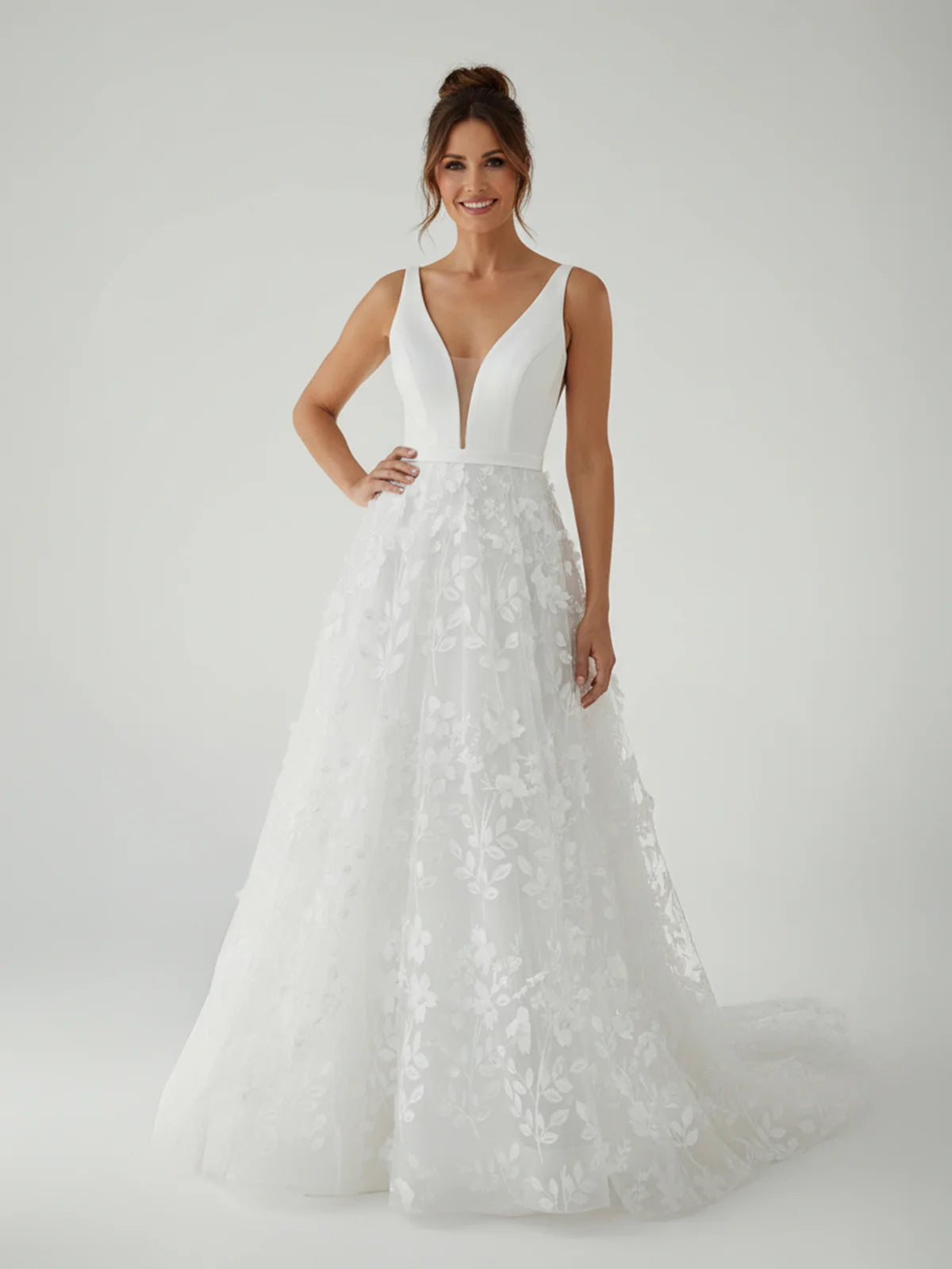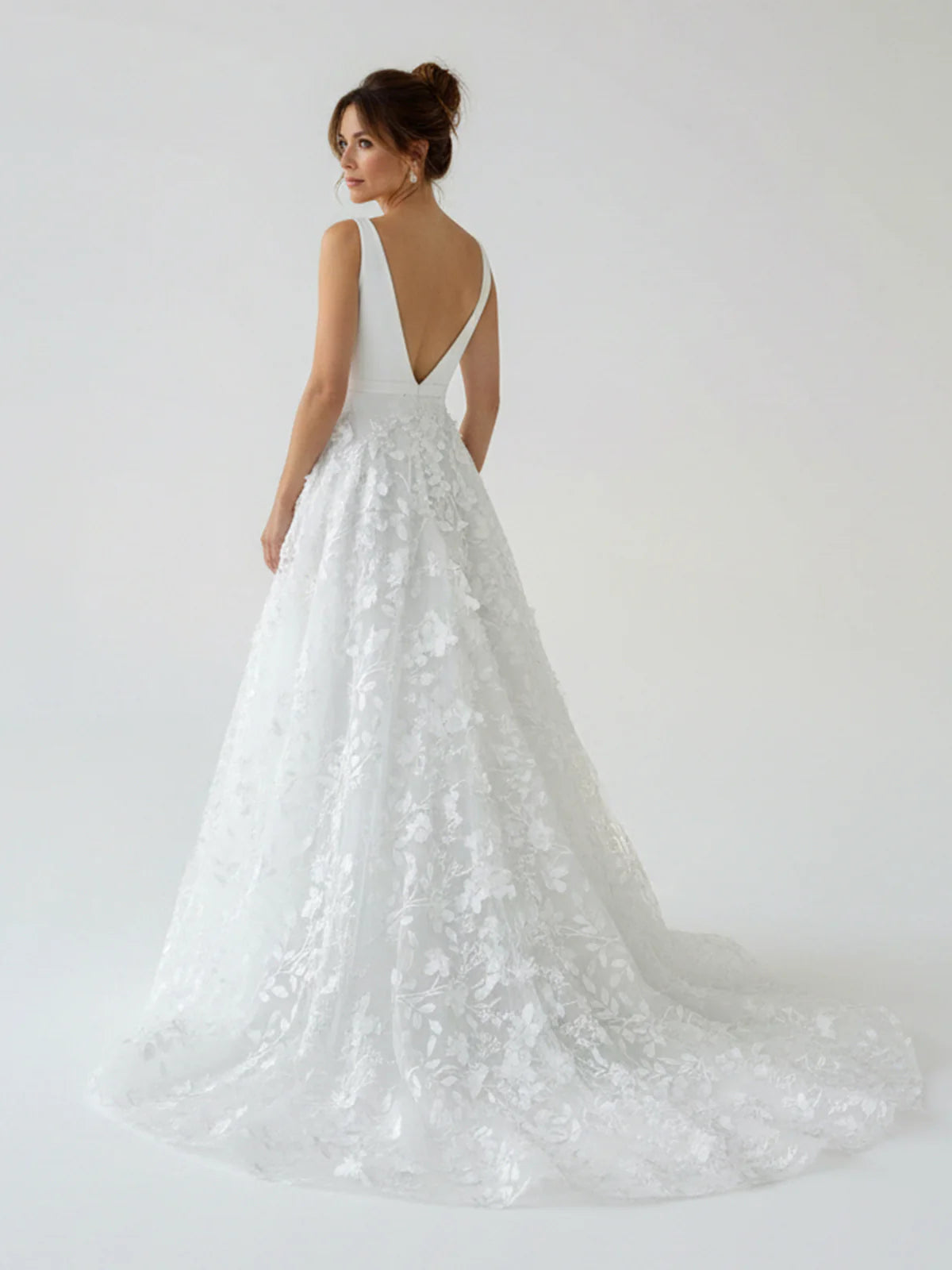 Elegant and timeless, this A-line tulle gown in classic white is perfect for a romantic bridal look. The V-neckline and sleeveless design create a flattering silhouette, while lace appliqué details add delicate texture and charm. The sweep train flows beautifully as you walk down the aisle, and the covered button back adds a refined, classic touch. A truly lovely choice for a memorable wedding day.