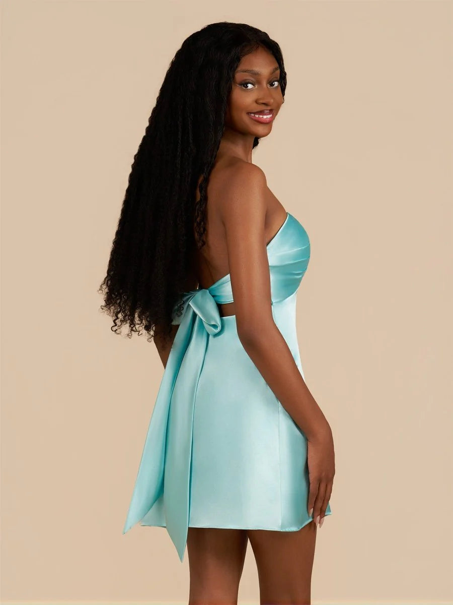 Designed in a flattering A-line silhouette with a strapless neckline, this homecoming dress features a charming keyhole detail that adds just the right touch of allure. The smooth satin fabric glows under the light, giving you that radiant party-ready look. Available in a vibrant range of colors, Talyra is perfect for homecoming, cocktail parties, birthday events, and more. The lace-up back ensures a snug, adjustable fit while the short length keeps things flirty and fun. Wherever the night takes you, Talyra promises to be the center of attention