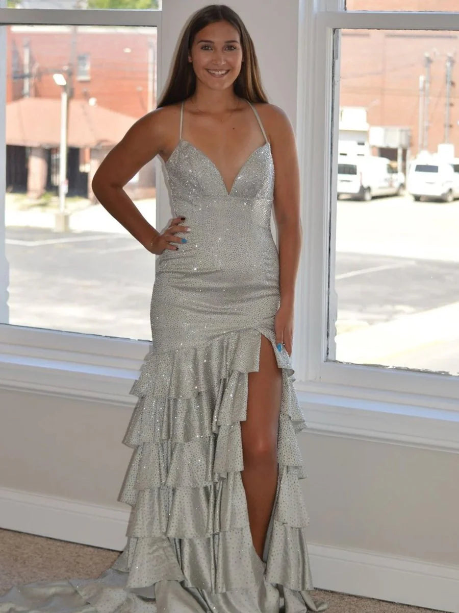 Step into the spotlight with the exquisite Charming Mermaid V Neck Black Satin Long Prom Dress. This stunning dress features a flattering mermaid silhouette that hugs your curves and flares beautifully at the hem. It is crafted from luxurious satin. The bold black color provides a striking canvas, while intricate beading details add a touch of sparkle, ensuring you shine throughout the night. An ideal choice for both evening dresses and formal dresses, with its V-neckline enhances your decolletage, creating an alluring yet elegant look, complemented by the sleeveless design for effortless movement. The lace-up back not only provides a customizable fit but also adds a hint of drama to your ensemble. The ruffles cascade gracefully, introducing a romantic element to the dress, making it perfect for any special occasion.