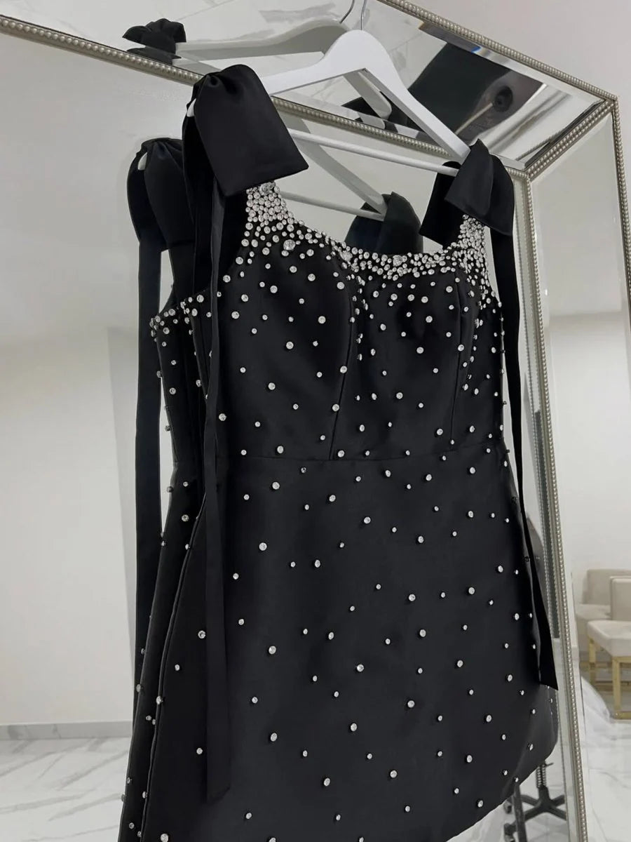 Designed in a flattering A-line silhouette, this short satin homecoming dress features a chic square neckline and a shimmering touch of hand-applied beading that catches the light with every movement. A delicate bowknot detail adds a playful yet elegant finish, while the lace-up back ensures an adjustable and secure fit. Whether you're headed to homecoming, a cocktail event, or a birthday party, the Valen dress delivers just the right amount of sparkle and sophistication. Its vibrant black satin fabric brings a fresh, youthful charm, making it the perfect choice for any celebration where you want to stand out in style.