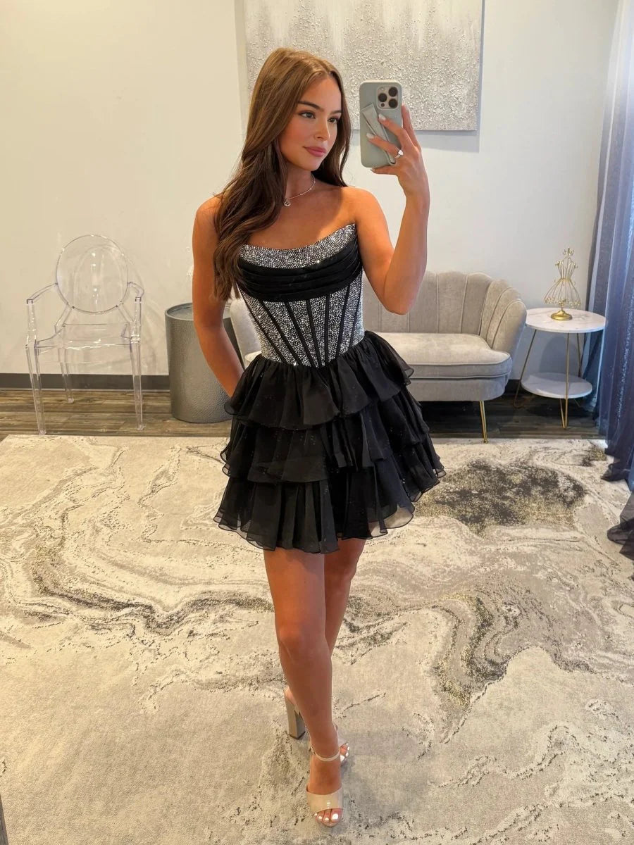 Crafted from breezy chiffon and adorned with sparkling beading and soft cascading ruffles, this dress brings effortless elegance to any special occasion. Its A-line silhouette offers a flattering and flowy fit, while the lace-up back ensures both comfort and adjustability. This Mini Party Dress is perfect for homecoming, evening parties, or any formal event, Amica is your go-to for youthful sophistication and standout style. With a range of vibrant colors to match your mood, this dress is perfect for any party where you want to shine.