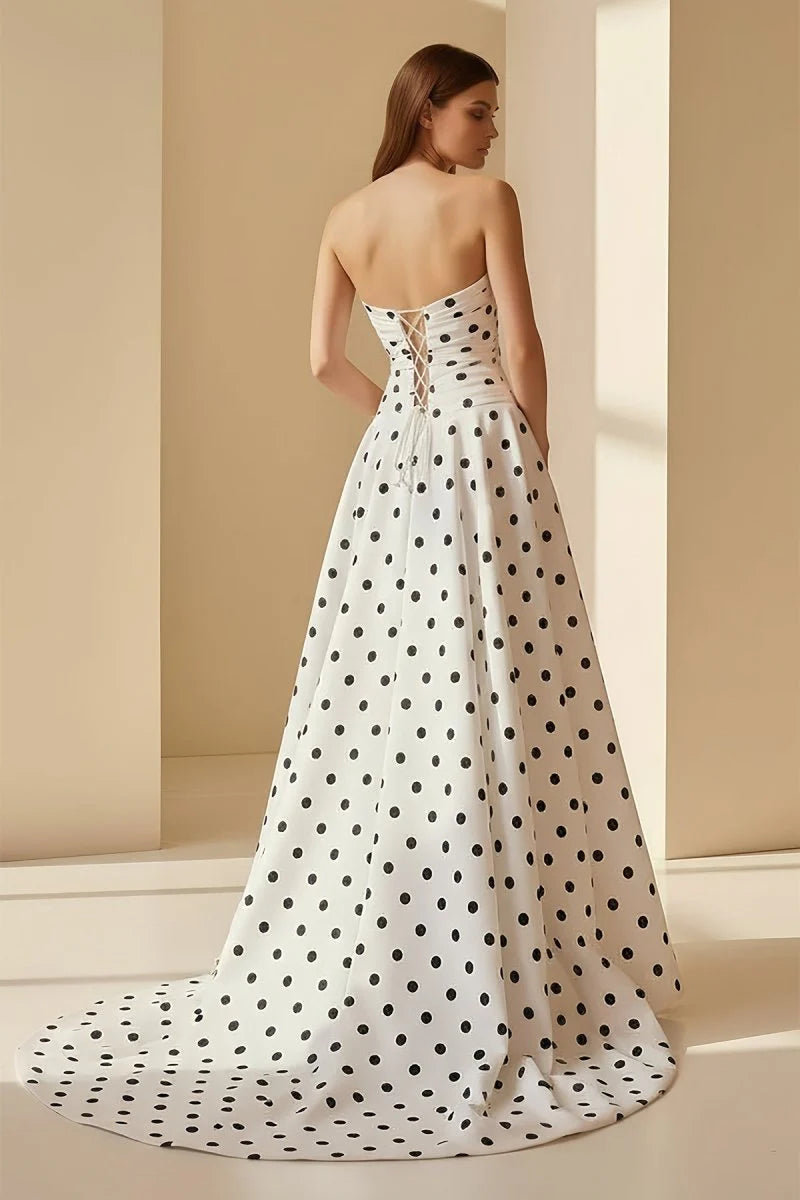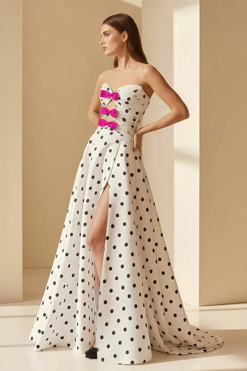 Step into elegance with this strapless A-line dress in crisp white satin. The sweep train adds a graceful flow, while a lace-up back ensures a perfect fit. Delicate polka dot detailing and a charming bowknot at the waist bring a playful yet refined touch. A subtle slit offers movement and allure, making this dress ideal for formal prom nights, gala events, or evening celebrations.